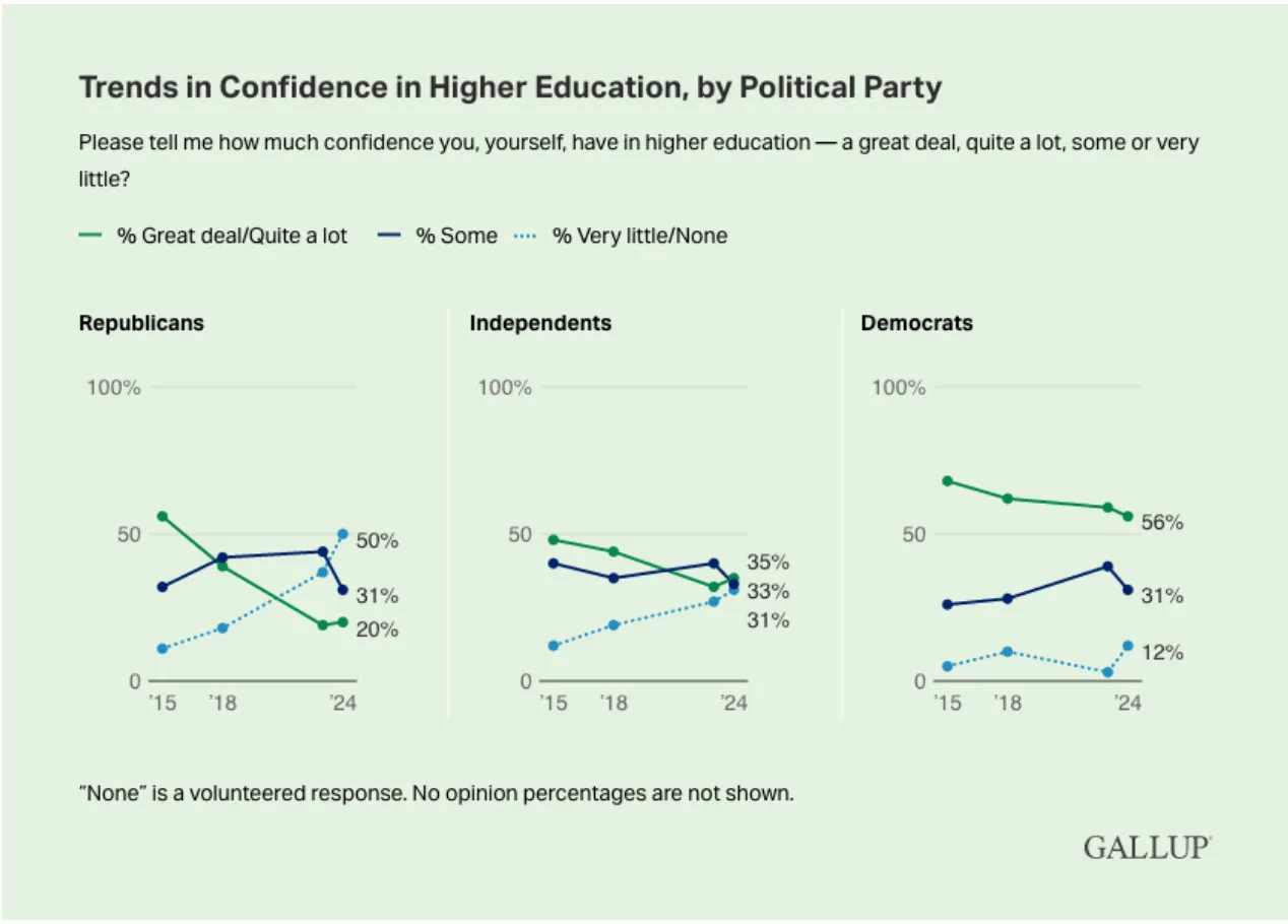 撇开特殊利益和特朗普的琐碎不谈,我的感觉是,还有一些更发自内心的事情正在发生。美国的一个强大派别已经对科学和专业知识产生了深深的敌意。作为证据,考虑一下过去十年共和党对高等教育的支持率的异常崩溃:图五。
