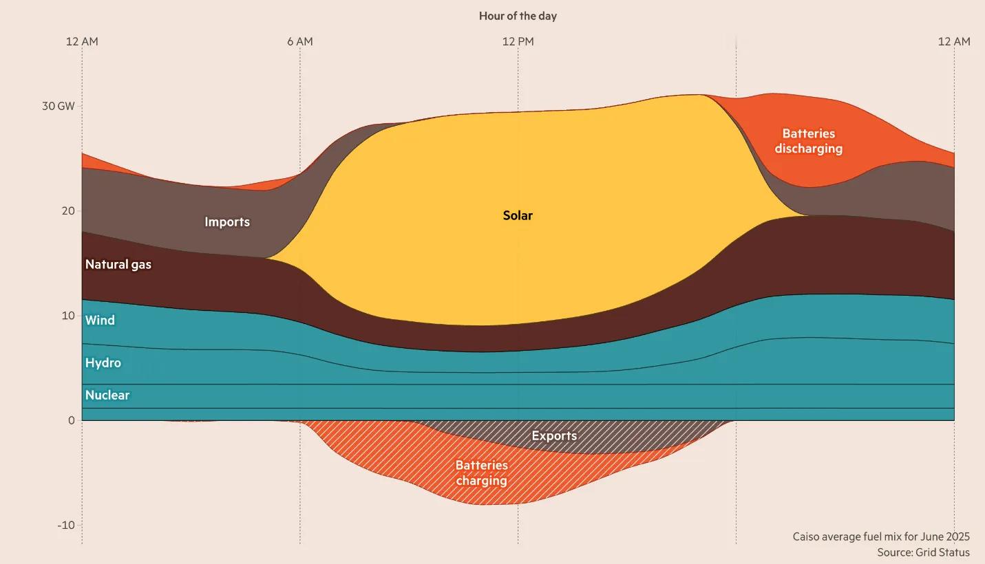 特朗普的能源部长克里斯·赖特表示,太阳能并不可靠:“当太阳落到云层后面和太阳落山时,你必须有电力,它几乎每晚都会这样做。”因此,地球上技术最先进的国家的能源部长并没有意识到,电池技术的巨大进步正在推动能源革命。革命现在正在美国发生,在加利福尼亚等地。以下是 6 月份加州平均一天的电力供应情况:图四。