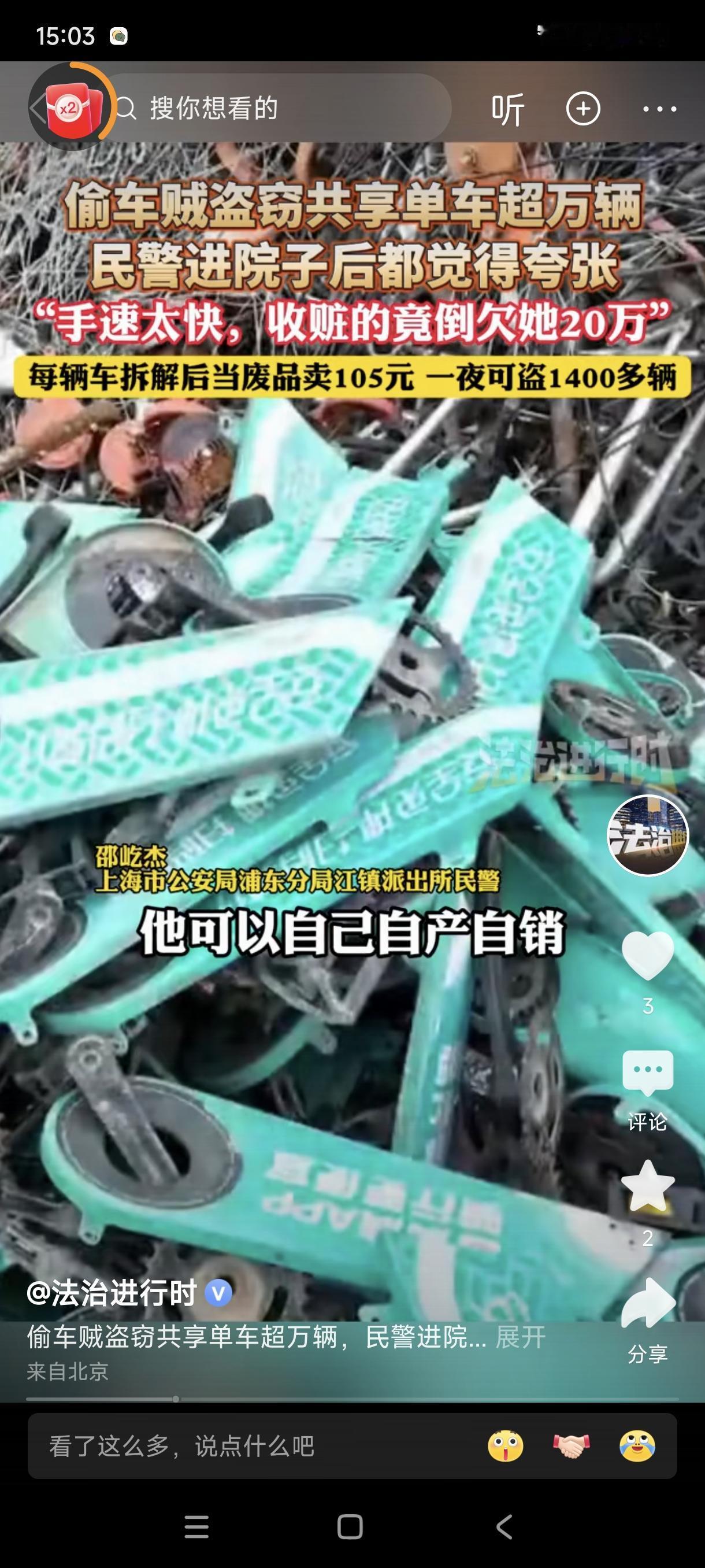 “这偷车贼也太‘牛’了吧!”近日,在上海,民警抓到了位偷车贼。但,这偷车贼的本事却让他们惊叹不已! 他能偷盗共享单车上万辆,最多一夜可盗1400辆;他能自己拆解单车零件,把它们当废品卖个105元;他能自己偷自己找到固定买家,甚至因为手速快,那买家还倒欠了他20万。 不得不说,这偷车贼是真的“666”!他这是把偷车当成了一个“行业”来发展,然后还把他给做到了极致! 试想下,如果他把这股认真的态度放到别的行业,那又会怎样呢? 果然,本事用对地方,利人利己!本事用错地方,脚踩缝纫机。 信息来源:法治进行时。偷车贼偷盗共享单车上万辆——