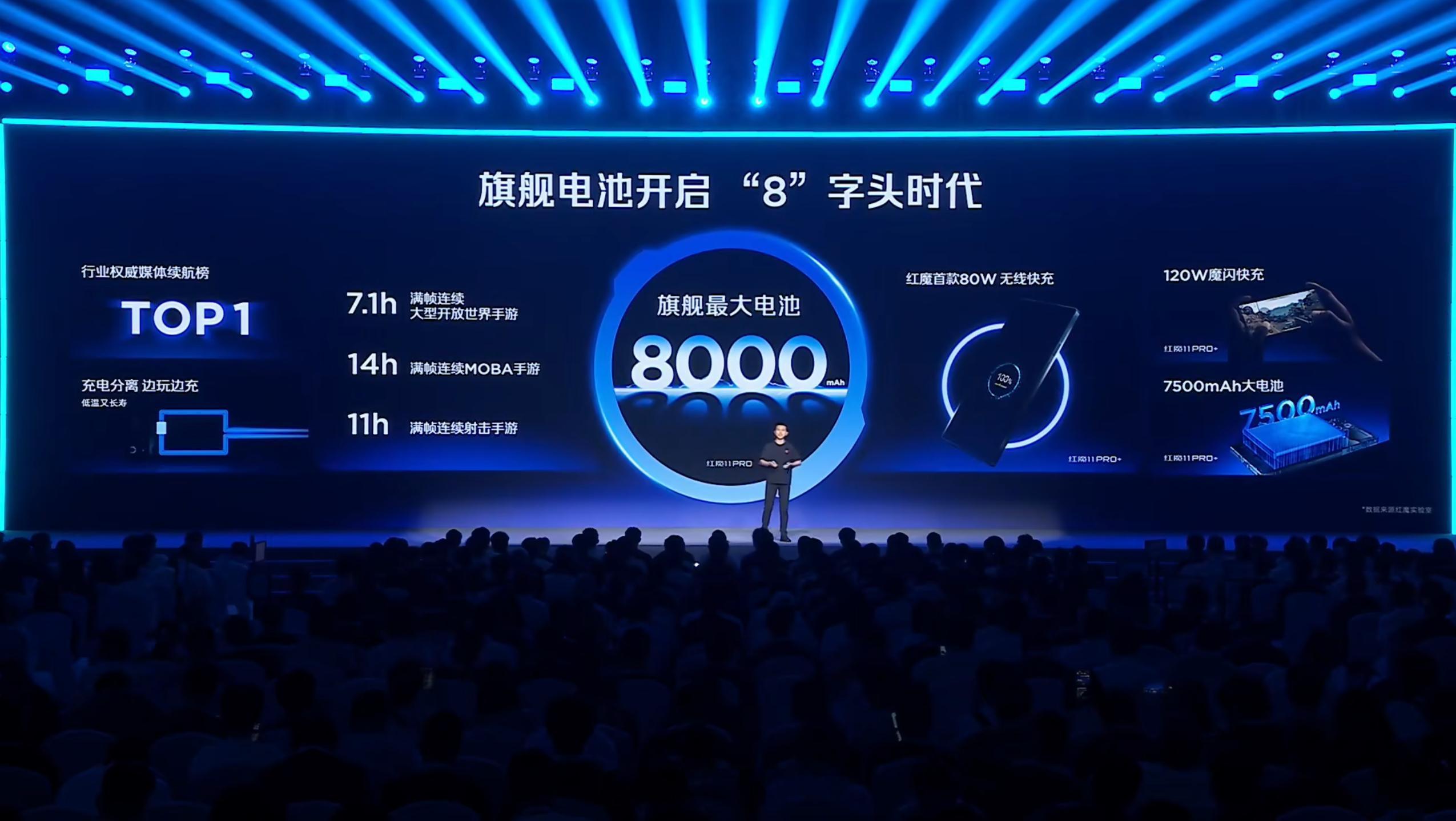 红魔上 8000mAh 了!红魔 11 Pro 内置 8000mAh 牛魔王电池,支持 80W 快充;红魔 11 Pro+ 内置 7500mAh 牛魔王电池,支持 120W 快充,80W 无线充电。