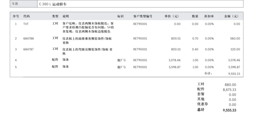奔驰c260l车型,车友投稿,他的这个h04装饰木纹饰板自然开裂了,就是我们常说的这个西装裤饰板好看是好看,但是在某些自然环境下面可能会发生自然开裂的情况,索性他还在质保期内,所以直接换了,可以看到他这个总计的价格是9500多块钱! 平时这两块板子在洗完车以后做清洁,不能大量的用水去擦,就算有湿毛巾去擦过以后也要及时用干毛巾去擦干,尽量不要让它泡水,不然可能就会因为潮湿或者是其他的因素发生开裂以及别的情况。