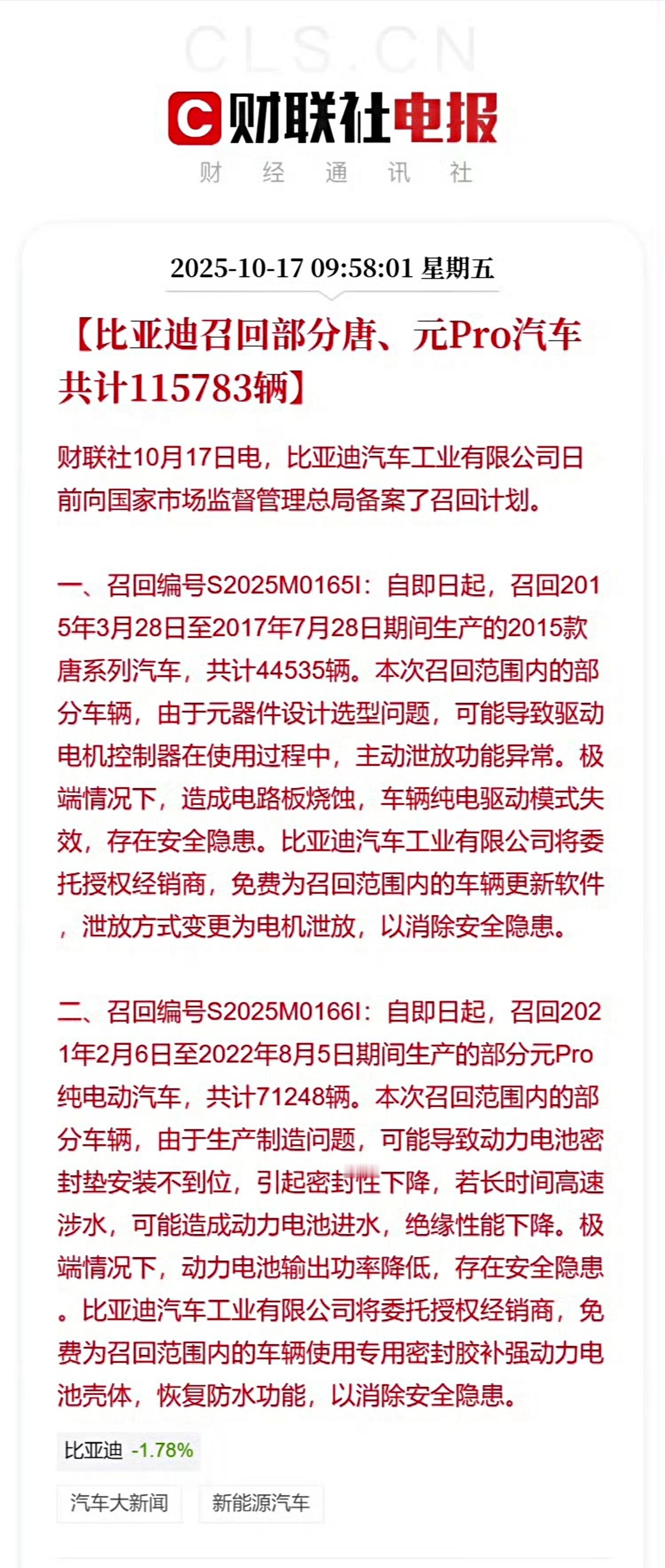 比亚迪召回115783辆汽车比亚迪车主情绪稳定,没有因为召回上热搜而甩锅给别的品