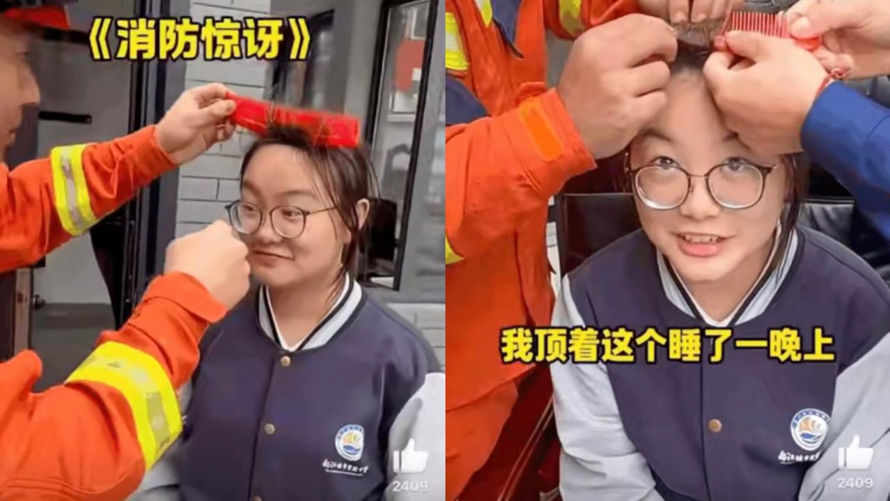 成都女生把梳子卡头发里睡了一整晚, 第二天顶着这“硬核造型”去学校, 直接被同学 围观到社死,最后没办法只能喊消防员来救场——你敢信这事儿是真的? 消防员到了现场也没绷住,边憋笑边解释“哥哥没笑你,就是头回见”。 然后拿小剪刀一点点剪梳子,拆刘海的时候比给易碎品打包还小心。 末了还不忘补一句“以后好好梳头”,又暖心又好笑。 其实这事儿看着逗,仔细想还挺有道理。咱平时总觉得“这点小事儿自己扛”。 结果卡个梳子都能从晚上困到早上,最后还是得靠专业的人来解决。 说真的,别硬撑,该求助就求助,消防员连梳子都能给你温柔解开,还有啥搞不定的? 你们有没有过这种“小麻烦硬扛成大社死”的经历?评论区说说,让大家乐呵乐呵顺便避个坑~头发被剪断