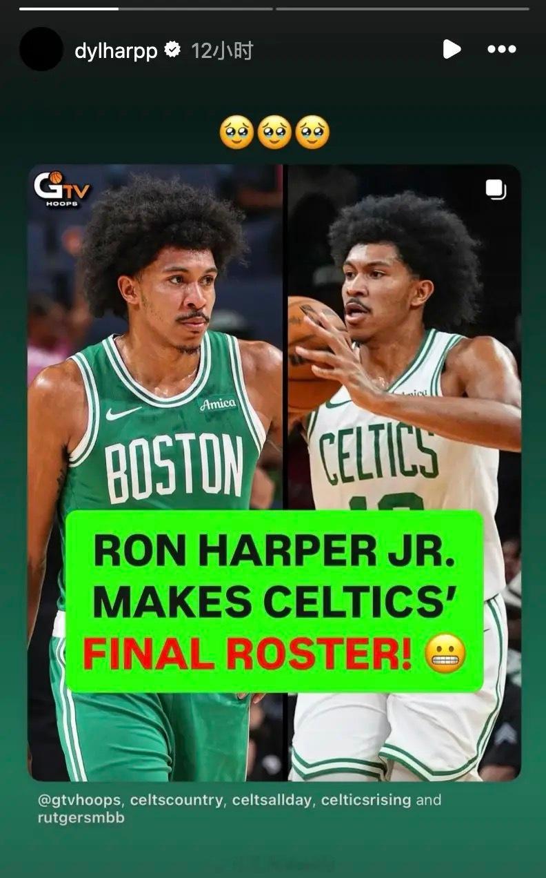 马刺榜眼迪伦-哈珀更新IG,庆祝小罗恩-哈珀在凯尔特人成功转正。
