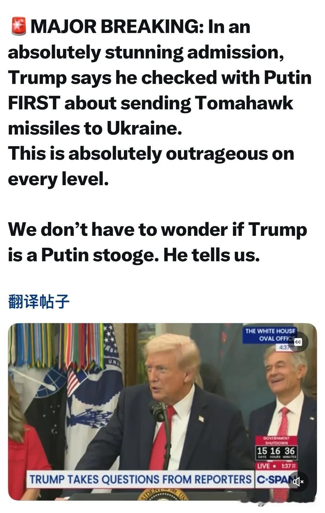 重大突发:川普在一个绝对令人震惊的自白中表示,他事先曾与普京沟通过向乌克兰运送战斧导弹一事。 这在各个方面都堪称离谱。 我们无需再怀疑川普是否普京的傀儡,他已经明确告诉我们了。