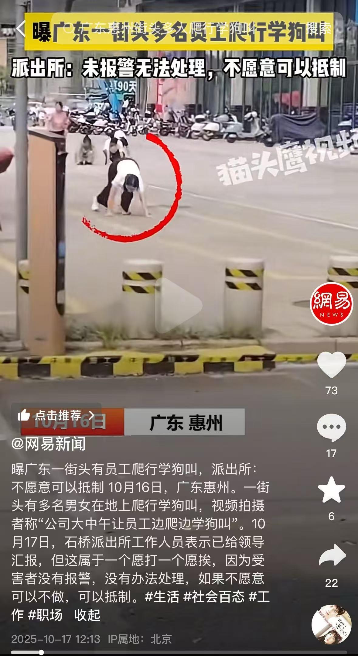 广东惠州,街头多名年轻男女四肢着地沿街爬行,期间还被迫发出“汪汪”的狗叫声。过往路人纷纷拿出手机拍摄,议论声此起彼伏。派出所表示:未报警无法处理,不愿意可以抵制。 (来源:网易新闻) 现场有一名男子在旁指挥并录像,爬行的几人动作迟疑,神情尴尬却未反抗,大约持续十分钟后便结伴离开。 开始有人认为是网红主播为博取流量而摆拍。 有本地网友爆料,附近某销售公司曾有类似“惩罚措施”,称未完成业绩的员工需接受跪爬、喝刺激性液体等“处罚”,事件矛头直指部分企业所谓的“狼性管理”。 随后,相关部门介入查询,但物业称未关注到该情况,人社局因无法确定涉事企业及行为性质难以推进,派出所则因未接到报警且无直接强迫证据,暂按“自愿行为”记录。这一回应引发公众质疑:难道职场尊严的守护,只能依赖受害者主动报警? 这场荒诞剧的争议在于“自愿”表象与法律底线的碰撞,即便涉事企业声称员工“自愿参与”,其行为也早已触碰多条法律红线。 1. 劳动法:职场管理的刚性底线 《劳动法》第九十六条明确规定:“用人单位不得侮辱、体罚、殴打、非法搜查和拘禁劳动者。” 若街头爬行学狗叫确为企业对业绩未达标员工的惩罚,或作为团建、考核的强制环节,便构成典型的“侮辱劳动者”行为。即便企业未使用明确的暴力胁迫,仅通过“不参与就边缘化”“爬完才能留任”等隐性压力迫使员工就范,也属于变相强迫劳动。劳动者可依据《中华人民共和国劳动合同法》第三十八条,以用人单位“以威胁手段强迫劳动”为由立即解除劳动合同,并要求企业支付经济赔偿。 2. 民法典:人格尊严的绝对保障 《民法典》第九百九十条规定,自然人享有基于人格尊严产生的人格权益;第九百九十五条明确,人格权受到侵害的,受害人有权请求行为人承担赔礼道歉、消除影响等民事责任。 街头爬行学狗叫的行为,无论是否存在外力强迫,均已构成对人格尊严的严重贬损。与私下辱骂仅侵犯个体人格权不同,这种在公共场合实施的侮辱行为,不仅伤害当事人情感,更破坏了社会对“劳动应被尊重”的基本共识。即便涉事者自称“自愿”,其背后的生存压力与职场胁迫也不能成为企业免责的理由,受害者仍可向法院起诉要求精神损害赔偿。 3. 治安管理处罚法:公然侮辱的追责依据 《治安管理处罚法》第四十二条规定,“公然侮辱他人”的,处五日以下拘留或者五百元以下罚款;情节较重的,处五日以上十日以下拘留,可以并处五百元以下罚款。 在人流密集的商圈实施爬行学狗叫,属于典型的“公然侮辱”行为。若查实由企业组织实施,公安机关可对企业负责人或直接组织者予以治安处罚;若情节恶劣,如多次实施、涉及人数众多,还可能构成《中华人民共和国刑法》中的“侮辱罪”,面临刑事追责。 截至目前,社区排查仍未锁定涉事企业,涉事员工也始终未露面发声,这场街头荒诞剧在“找不到追责对象”的无奈中暂告一段落。 秋日生活打卡季