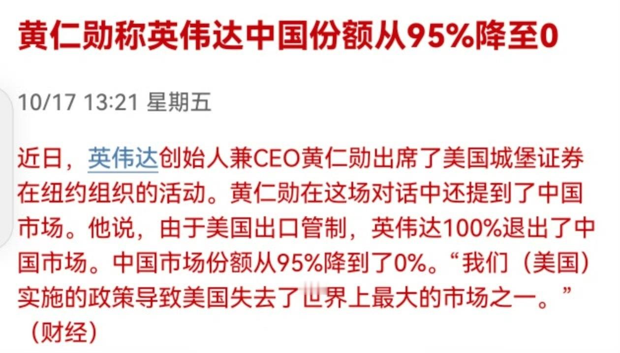 真的吗?[doge][doge][doge]黄仁勋称英伟达中国份额从95%降至0