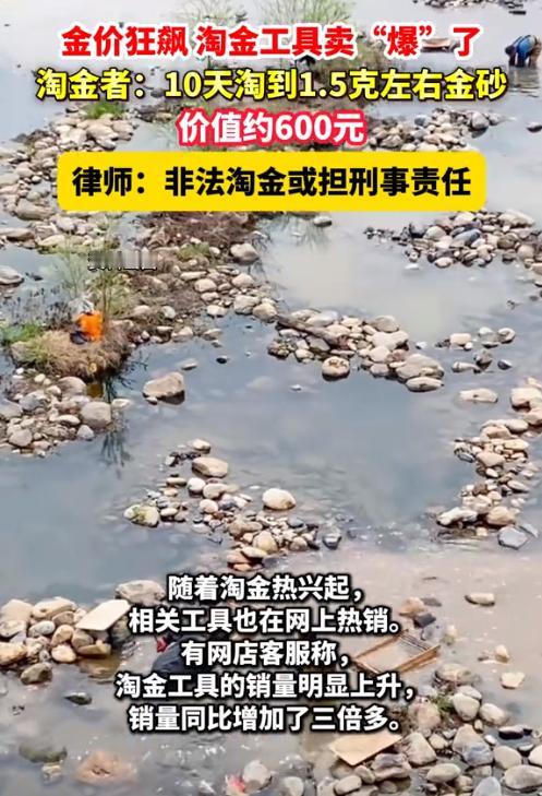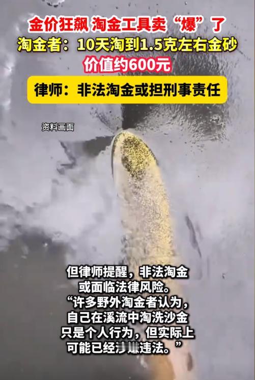 江西,一伙子发现最近金价飞涨,于是买了淘金工具,时不时去溪边碰碰运气,谁知还真给他淘到一些。而和小伙子抱有同样想法的人还挺多,这导致网上淘金工具都给卖爆了。可他们不知道的是,这看似充满机遇的淘金行动,实则暗藏风险。(来源:杭州网) 最近国际金价像坐了火箭一样猛涨,国内黄金价格也跟着一路飙升。这股热潮让不少人动了心思,有人则跑到山涧沟溪边,当起了淘金者,想着能捞上一笔。 25岁的江西小伙李某拿着淘金工具,正猫着腰在一条小溪中忙活,他是这波淘金热里最普通的一员。 从今年3月起,每个周末天不亮,李某就往山里赶。凌晨5点半,山谷里还飘着薄雾,他就已经踩进齐膝深的冷水,双手攥着个脸盆大的洗沙盘,从河底一捧捧舀起沙石,在水面轻轻晃动。 "你看,金砂重沉在底下,沙子石子就顺着水流跑了。"李某头也不抬地与旁边的伙伴说着。 刚开始,李某就是周末来碰碰运气,后来看到金价一个劲往上涨,干脆把工地的活儿给辞了,专心干起了淘金工作。 现在溪边早聚起了十几号人,大家自发分了工,壮实的汉子负责在下游挖沙,眼尖的妇女蹲在石头上筛选,最后几道淘洗工序则留给最有经验的老手。 这群人大多是刷短视频学的技术,网购个洗沙盘、塑料铲就开工,谁都盼着能从沙子里淘出几粒"金豆豆"。 淘金的人一多,网上的工具店先火了。电商平台上卖洗沙盘的店铺月销轻松破千,金属探测器更是成了抢手货。 据河北一家厂家的客服说,最近天天能接到上百个咨询电话,千元左右的入门款最受欢迎,江西、湖南那边的买家居多。 然而大家这么热火朝天的在溪边淘金,却不知该行为可能已经违法。 从法律角度来讲,黄金属于稀有金属,同时也是矿产资源。 《矿产资源法》第4条规定,矿产资源属于国家所有,由国务院代表国家行使矿产资源的所有权。地表或者地下的矿产资源的国家所有权,不因其所依附的土地的所有权或者使用权的不同而改变。 由此可见,不管是地下的黄金还是地面的黄金,亦或者是溪流中的黄金,都是国家的东西。 普通老百姓想要获得黄金的开采权,就必须取得采矿许可证,且在规定的范围内开采。 像李某这样的私人淘金人,如果没有采矿许可证的,他们的行为就是违法的。 《矿产资源法》第64条规定,违反本法规定,未取得采矿权开采矿产资源的,由县级以上人民政府自然资源主管部门责令停止违法行为,没收直接用于违法开采的工具、设备以及违法采出的矿产品,并处违法采出的矿产品市场价值3倍~5倍罚款;没有采出矿产品或者违法采出的矿产品市场价值不足10万元的,并处10万元~100万元以下罚款。 如果李某等人所淘黄金价值达到了1000元,那不仅要被没收违法所得,还要罚款3000~5000元,同时还要出最低10万元的罚款,这得不偿失啊。 当然处罚不止如此,这还只是行政处罚。如果李某等人淘金价值数量较大,达到了10万~30万元以上的,可能被认定为非法采矿罪,处3年以下有期徒刑、拘役或管制。 可是还有不少人认为,在自然的溪流中淘点金砂,就是自己玩一玩,赚点小钱,又没干啥坏事,怎么就算违法了呢? 还有人表示,他们淘到的金砂也没多少,不应该被处罚。 对此,您怎么看?欢迎留言交流。