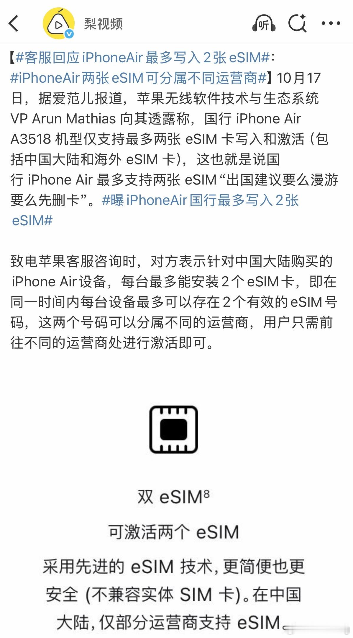 客服回应iPhoneAir最多写入2张eSIM本以为“极其先进”的功能eSIM真的能落地,虽然外版机无法写国内运营商eSIM,但是国行机出国还是可以用海外的eSIM。