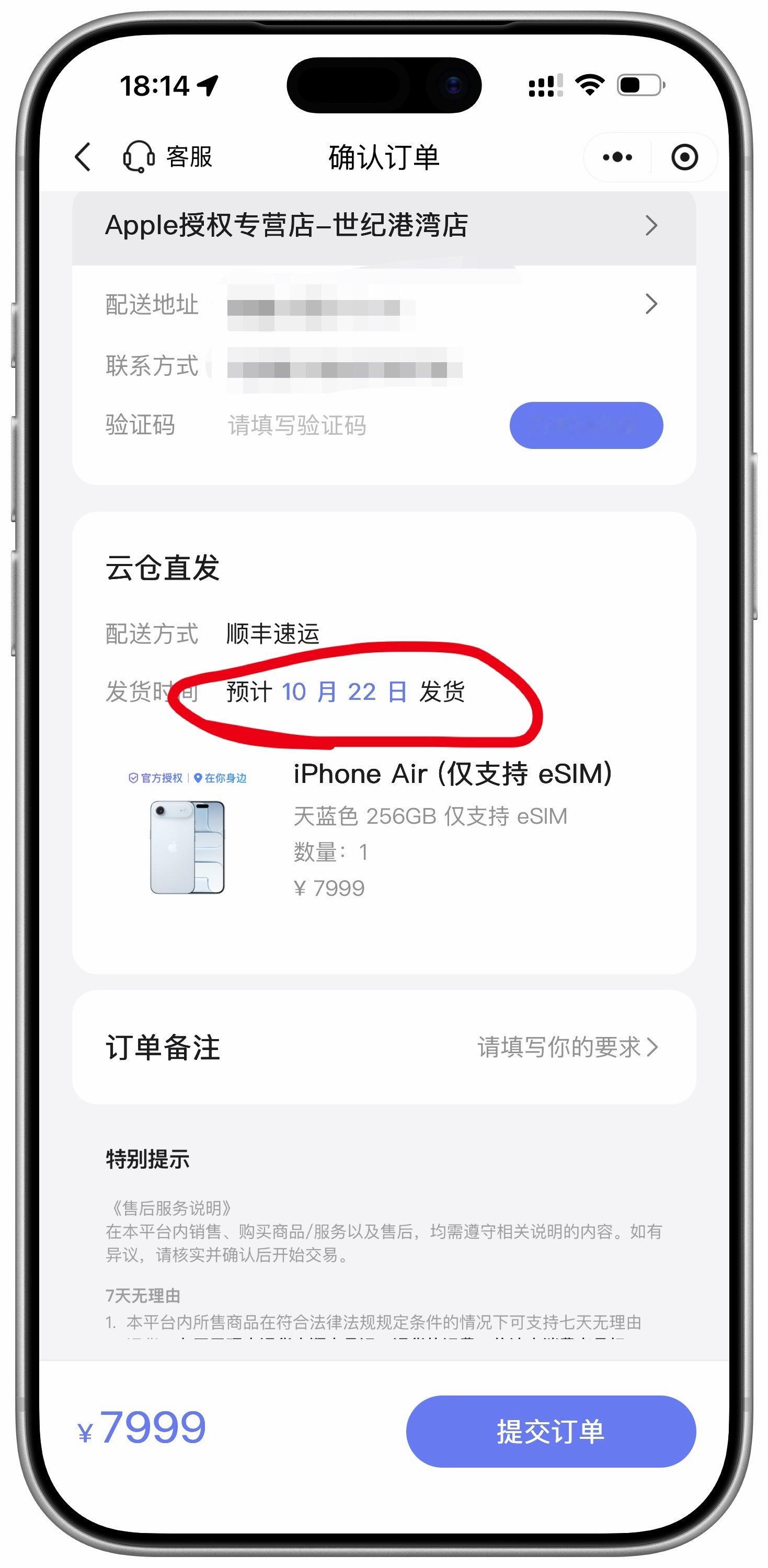 iPhone Air估计没什么溢价,Apple 授权店小程序现在买还是22号到货。[淡淡的]
