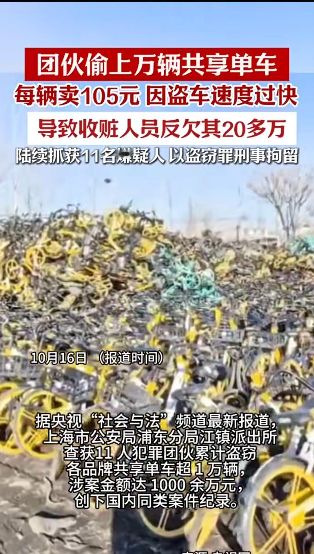 上海惊现"偷车KPI团伙"!11人偷1万辆共享单车,收赃的倒欠20万 2023年6月1日上海警方端了个共享单车盗窃团伙,11个人偷了超1万辆车,涉案金额1000多万,最魔幻的是收赃的因为他们偷得太快,反倒欠了20多万。 这伙人偷车跟开流水线似的,分工比正经公司还明确。有人在地铁口、小区边盯车,有人拿工具撬锁拆车,还有人开车拉货,一套流程下来比外卖小哥送单还麻利。拆完就按105块一辆卖给收赃的,本来以为是双赢的"买卖",结果把下家坑惨了。 收赃的一开始美得不行,想着低价收零件转卖赚差价。没成想这伙人偷车速度跟开了倍速似的,每天送过来的零件堆得比人还高,收赃的钱花光了都处理不完。最后一算账,不仅没赚钱,还倒欠盗窃团伙20多万,估计当时都想求饶"别偷了,我实在接不住"。 咱平时骑共享单车总愁找不到车,合着有些车是被这伙人偷去拆了。网友都笑称这是"盗窃界的卷王",把偷车搞成KPI考核,也是没谁了。现在这11个人都被抓了,案子还在办着。 这案子说出来都像段子。可这么多车被盗,以后咱们骑车还能安心吗?共享电单车乱象 电瓶车偷车 偷单车 盗窃共享单车 作者声明:素材来源网络