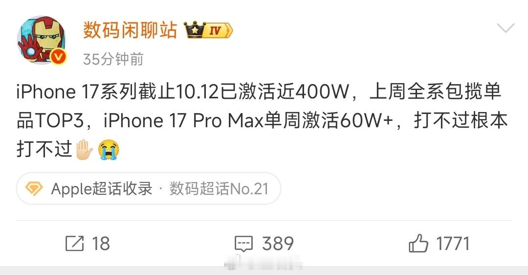 截至10月12日,iPhone 17系列在国内市场已实现近400万台激活量,热度持续领跑。