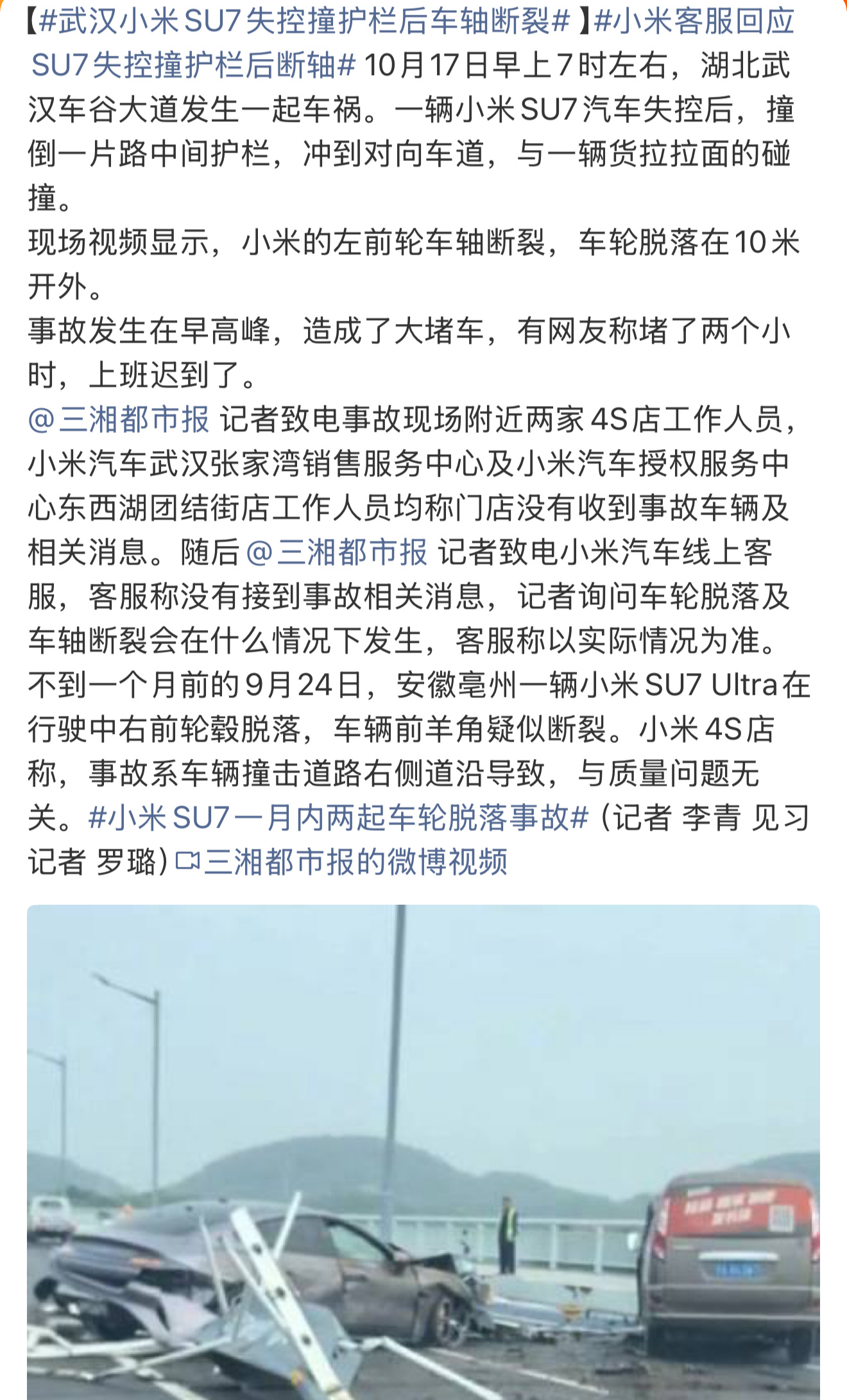 武汉小米SU7失控撞护栏后车轴断裂小米汽车现在似乎正在被媒体用放大镜观察,只要一有点事故就要上热搜[笑cry]