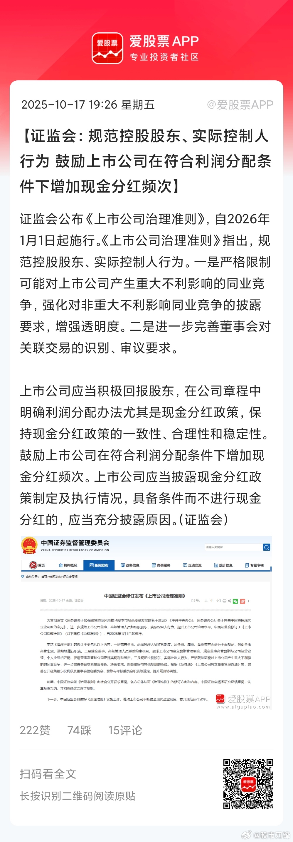 今天大跌后,虽然村里没有直接喊话安抚。但公布《上市公司治理准则》,一是规范控股股东、实际控制人行为;二是上市公司应当积极回报股东,比如增加现金分红频次等。