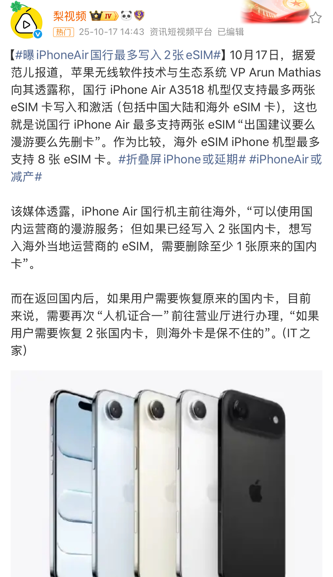 如果出国旅游、临时办卡直接卡脖子。明明在技术层面能支持更多,偏要人为设限。关键eSIM是未来的趋势,结果搞出这种“半吊子”的体验[流汗]。