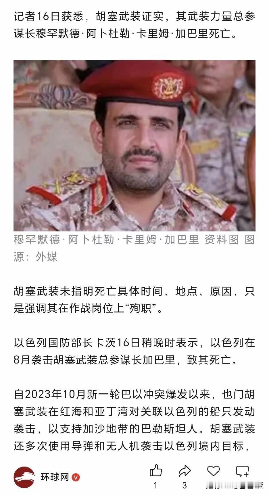 人狠话不多,说的就是以色列。 这次以色列又悄悄行动,干了一件大事。 把中东地区叫得嚷嚷的胡塞武装,来了一个下马威。 这次直接把胡塞的总参谋长,一次干掉了。看来小霸王对付这些人,斩首很有一套啊。