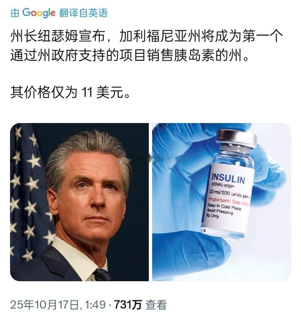 🔻加州宣布直销胰岛素,价格仅11美元。州长加文纽森说这是非常简单实惠的医疗保健
