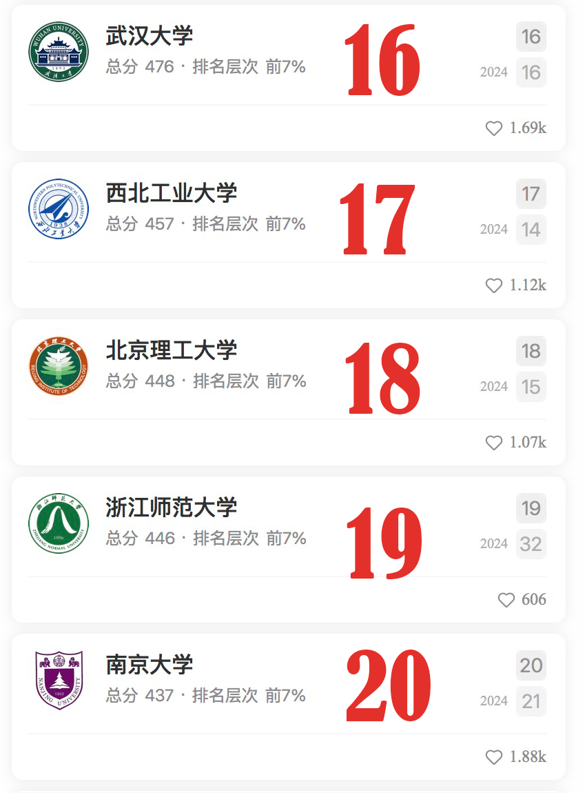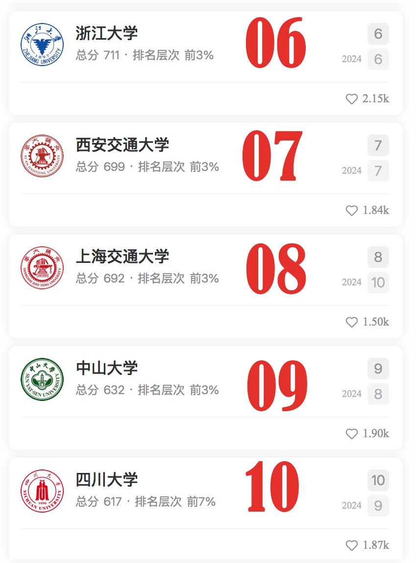 退步大的: 部分传统985名校出现大幅下滑。 南京大学、中山大学、东南大学都下滑很厉害。
