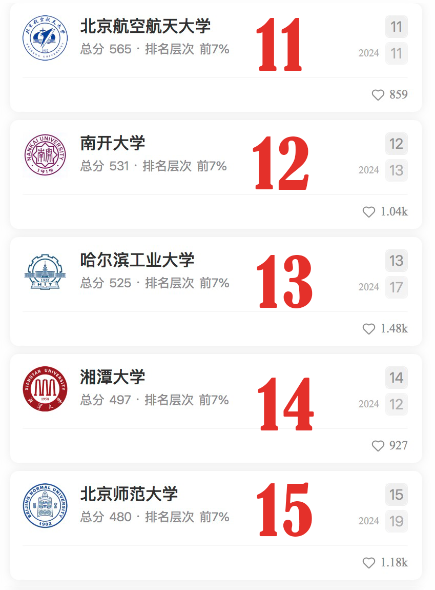 进步大的: 受益于近年来国防军工类大学受到欢迎,生源逐年向好,他们的数学学科也大幅提升。 1.西北工业大学、北京理工大学从五年前的40多位大幅攀升到17、18位。 2.同样国防七校的北京航空航天和哈工大也大大进步。