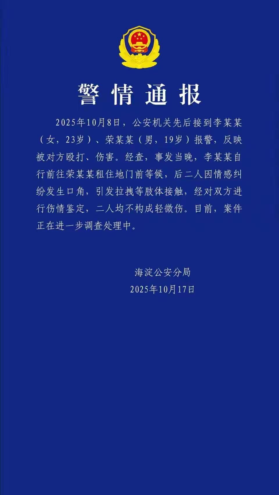 看来当事男女双方说的都有问题,就是一个感情纠纷和互殴的问题。李禹熹到荣梓杉家就感情问题讨要说法,荣梓杉不想与对方复合,结果产生了口角和肢体冲突,双方报警但身体都没怎么受大伤,警方只好调解处理。女方年龄23岁,男方年龄19岁,估计两人交往时男方只是想玩玩,女方却当真了要嫁过去。男方不仅家里不同意,而且还是刚入大学在校的学生,出现这样的矛盾也可想而知。