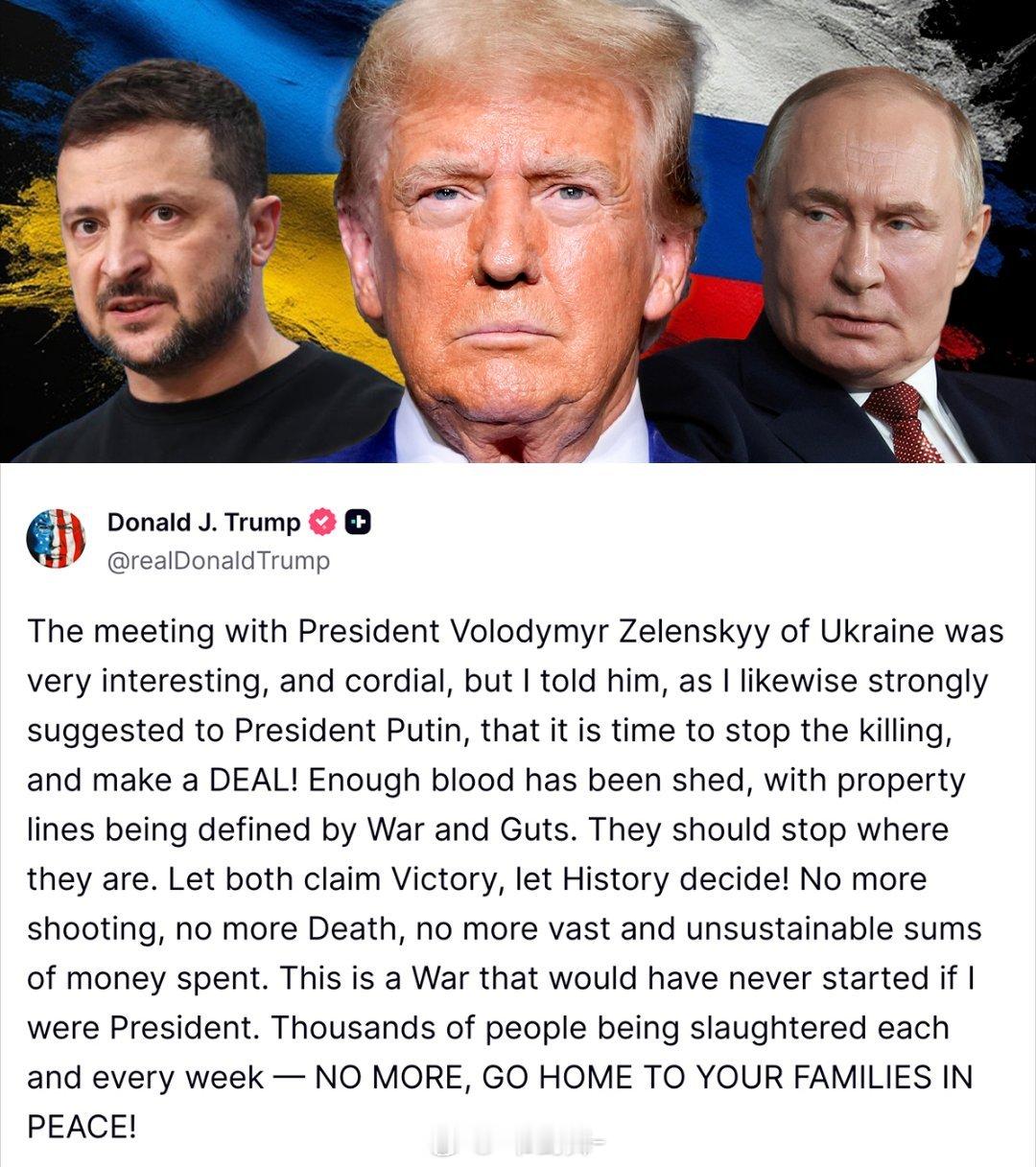 特朗普在与泽连斯基会晤后发帖:该停止杀戮了!领土不该由战争决定——让双方都宣称胜利,让历史评判![污][污]