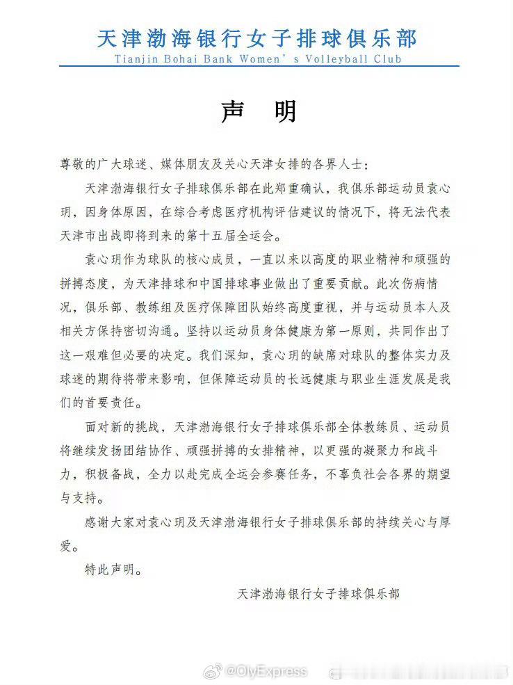 十五运会天津女排发表声明:袁心玥因“身体原因”缺席全运会