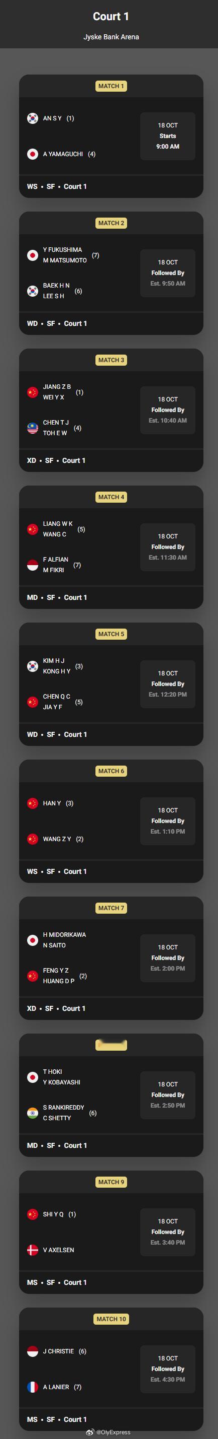 【丹麦羽毛球赛半决赛赛程对阵】2025年丹麦羽毛球公开赛羽联超级赛10月18日丹麦欧登塞,2025世界羽联超级750丹麦公开赛将进行半决赛,比赛将于北京时间15时开始。国羽赛程对阵如下,完全赛程对阵见图: