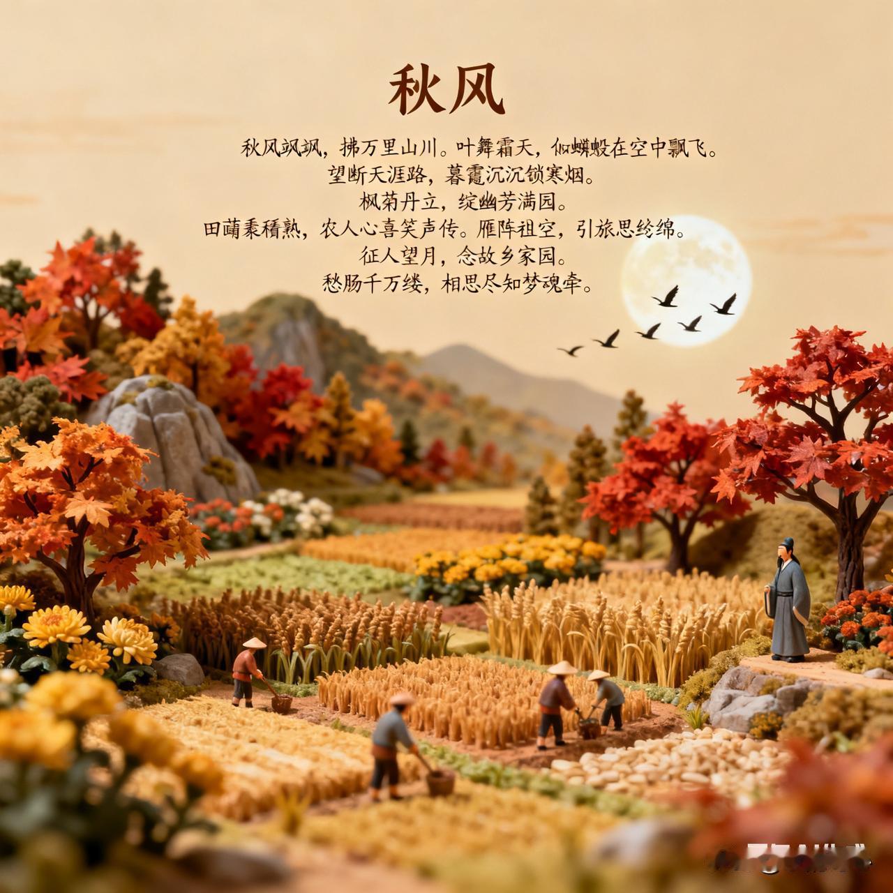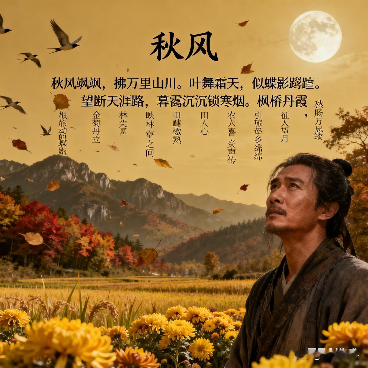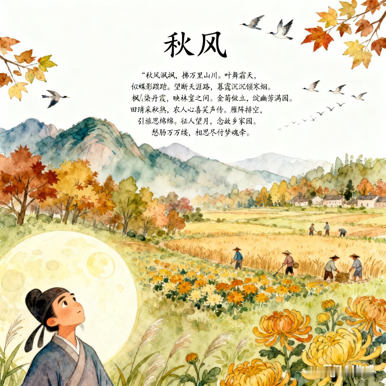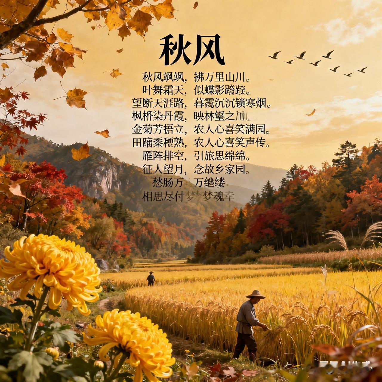《秋风》乐韵诗心原创诗词: 秋风飒飒,拂万里山川。叶舞霜天,似蝶影蹁跹。望断天涯路,暮霭沉沉锁寒烟。 枫染丹霞,映林壑之间。金菊傲立,绽幽芳满园。田畴黍稷熟,农人心喜笑声传。 雁阵排空,引旅思绵绵。征人望月,念故乡家园。愁肠千万缕,相思尽付梦魂牵。 秋夜无眠,听风语缠绵。寒星几点,伴孤灯残焰。岁月如流水,繁华过眼总成幻。且把闲情寄,静赏秋光度流年。 秋风起,吹过广袤的山川大地。树叶在霜天中飞舞,好似蝴蝶在空中轻盈地蹁跹。极目远眺,天边暮霭沉沉,锁住了那一抹寒烟。 枫叶红如丹霞,点缀在林壑之间;金黄的菊花傲然挺立,在园中绽放着清幽的芬芳。田野里的庄稼成熟了,农民们的脸上洋溢着喜悦的笑容。 排成阵的大雁排空而去,勾起了旅人的思乡之情。征人望着明月,心中思念着故乡的家园。愁肠百结,只能把无尽的相思寄托在梦魂之中。 秋夜难眠,静听秋风诉说着缠绵的话语。天空中闪烁着几点寒星,陪伴着一盏孤灯的残焰。岁月如流水般匆匆而过,繁华如梦,过眼皆成虚幻。不如将这份闲情逸致寄托于秋光,静静度过这美好的流年。