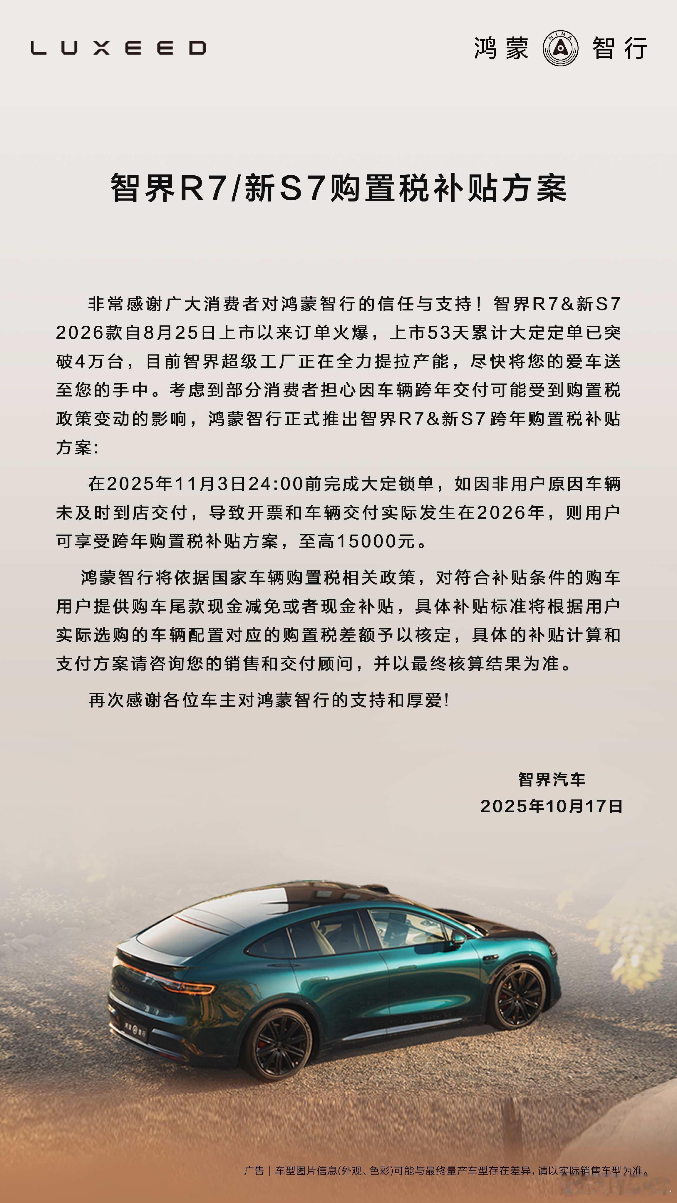 智界汽车推出购置税补贴方案 智界汽车发布智界R7及新S7 2026款购置税补贴方案。在2025年11月3日24:00前完成大定锁单的用户,因跨年交付可能涉及的购置税政策变动问题,可享至高15000元的购置税兜底。 智界s7 智界R7