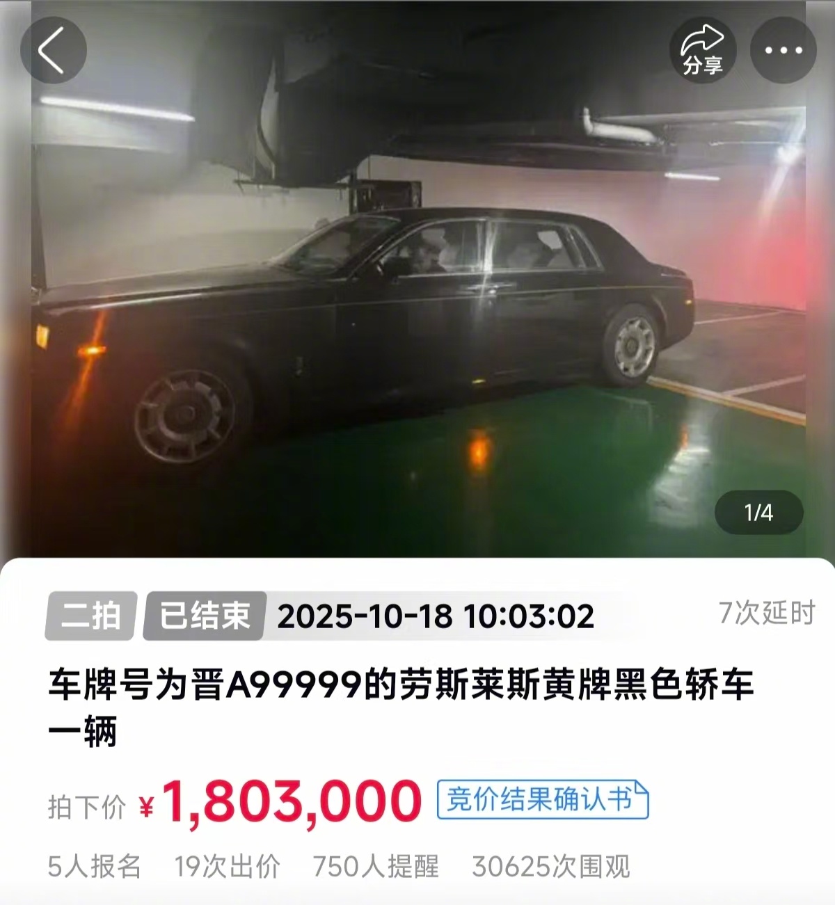 【#晋A99999劳斯莱斯二拍拍出180.3万#】10月18日上午,大皖新闻记者从阿里资产平台看到,车牌号为晋A99999的劳斯莱斯黄牌黑色轿车,二拍拍出180.3万。车辆起拍价154.4万元,吸引5人报名,19次出价。