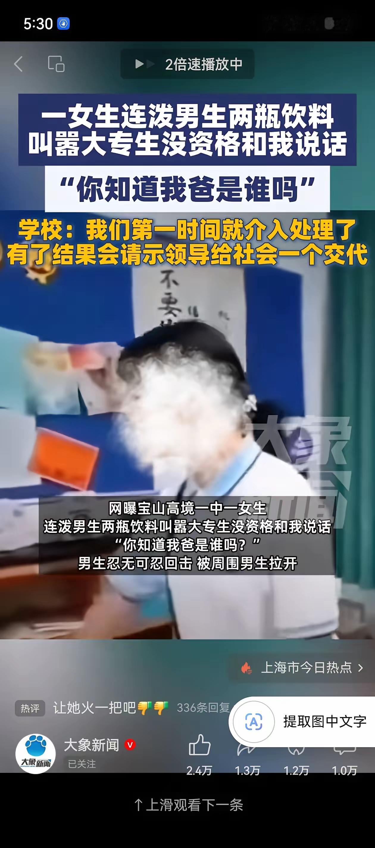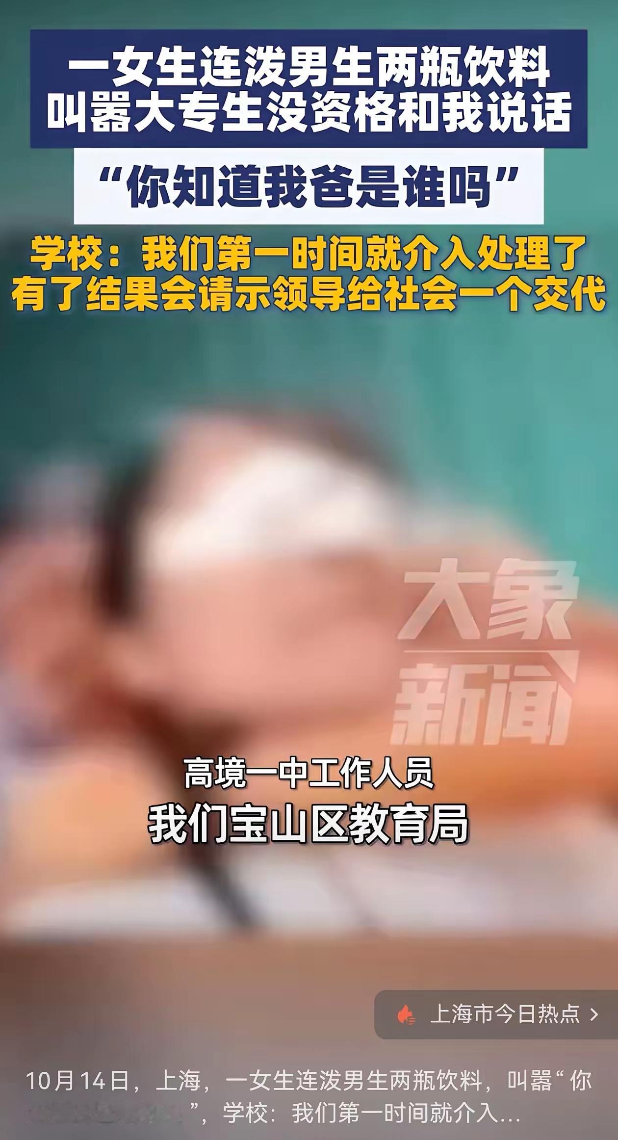 2025年10月14日,上海宝山区一高中女生和一个男生发生冲突。 女生很彪悍,不仅口头上占上风,还接连开了两瓶饮料,一直向那个男生的头上和身体上泼饮料。 视频很清晰:“我告诉你,像你这种高中、大专生有资格和我说话吗?你知道我爸爸是干什么的?” “我一点都不好惹”! 信息来源:大象新闻 网友评论: 这所学校是市重点高中,里面的学生都是品学兼优的学生才能进去的,怎么还会出现这种情况? 被欺负的男生及家人一定要不负众望,找到它爸,要不然它会伤心的[捂脸] 实际情况不知道咋样,但这个女生大庭广众之下用饮料去泼男生绝对是一个暴力的做法。是对人格的侮辱。希望有关单位应正确处理! 嘴里叫嚣着:你知道我爸爸是干什么的?什么样的家长能教出这样的孩子?有钱有势了不起吗?学习好了不起吗?学习不好没权没势就不配做人吗?还有拉偏架的孩子难道一点人性和良知都没有?