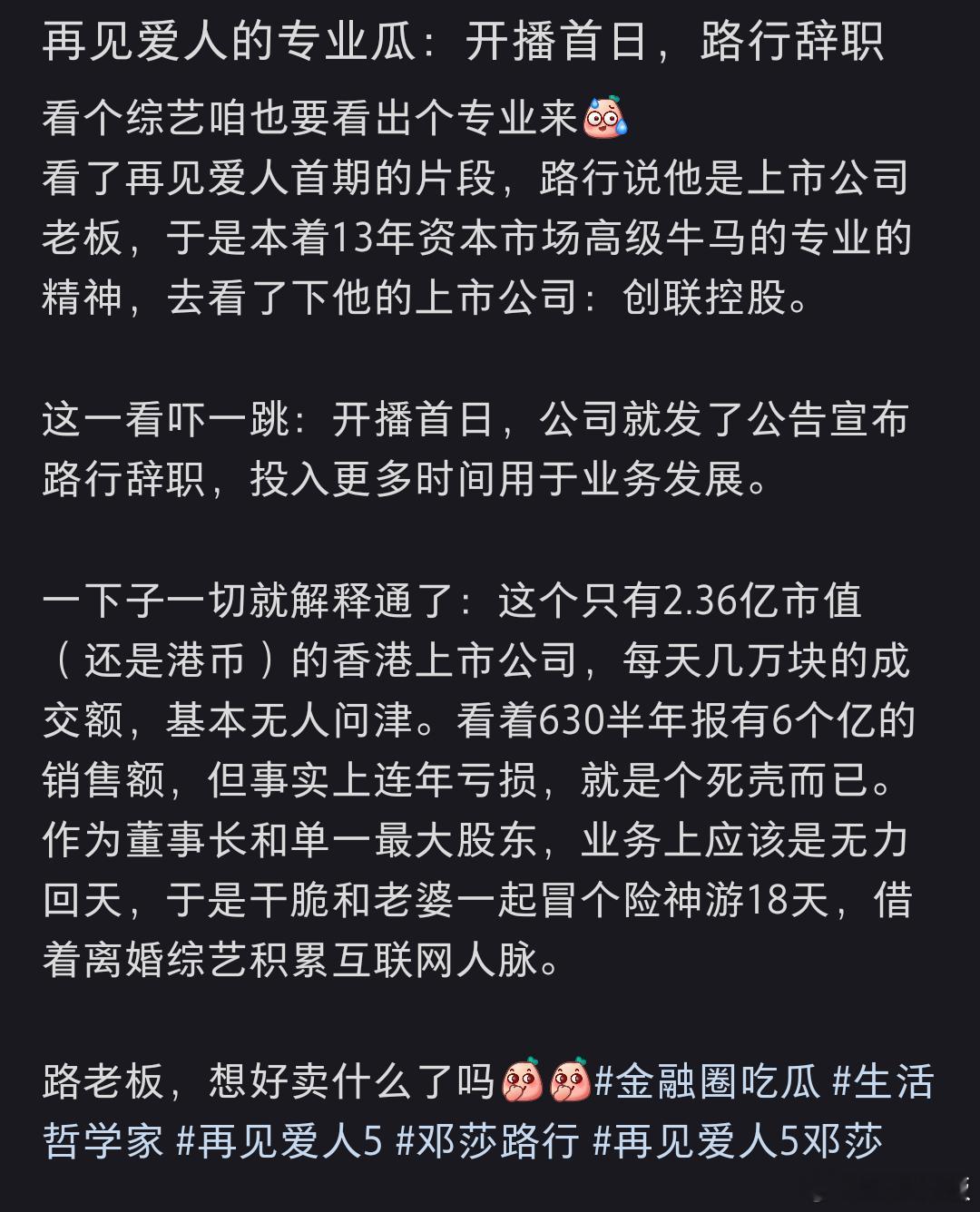 再见爱人一开播路行就辞职了 天哪网友真神了,现在就已经有人扒出说再见爱人刚开播的那天路行就已经辞职了,是公司太不赚钱所以想着和邓莎上节目来转变赛道了吗[泪奔][泪奔]之前好多人说他是大富豪,结果好像和大家描述的情况不太一样,最近几年企业确实不好干,比起开公司还是互联网这口饭吃起来更简单[泪奔][泪奔][泪奔]微博视界大会剧综大咖开放麦