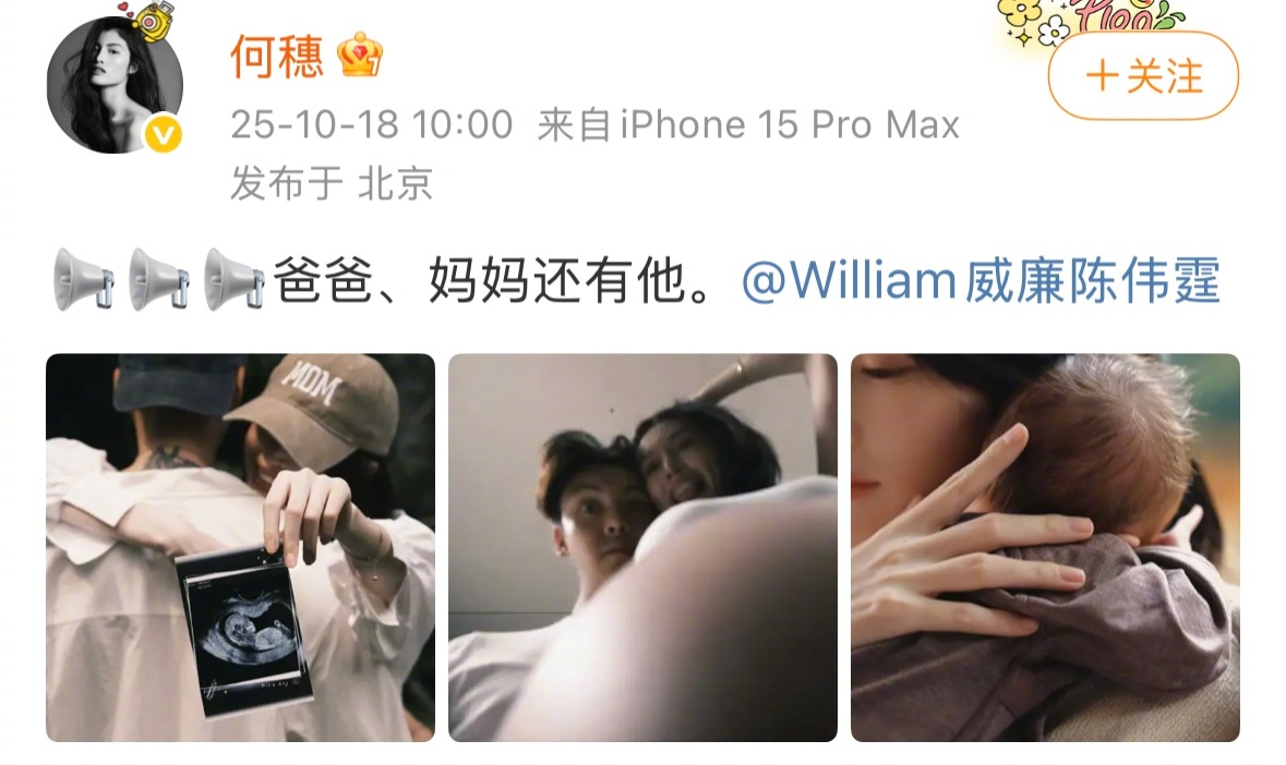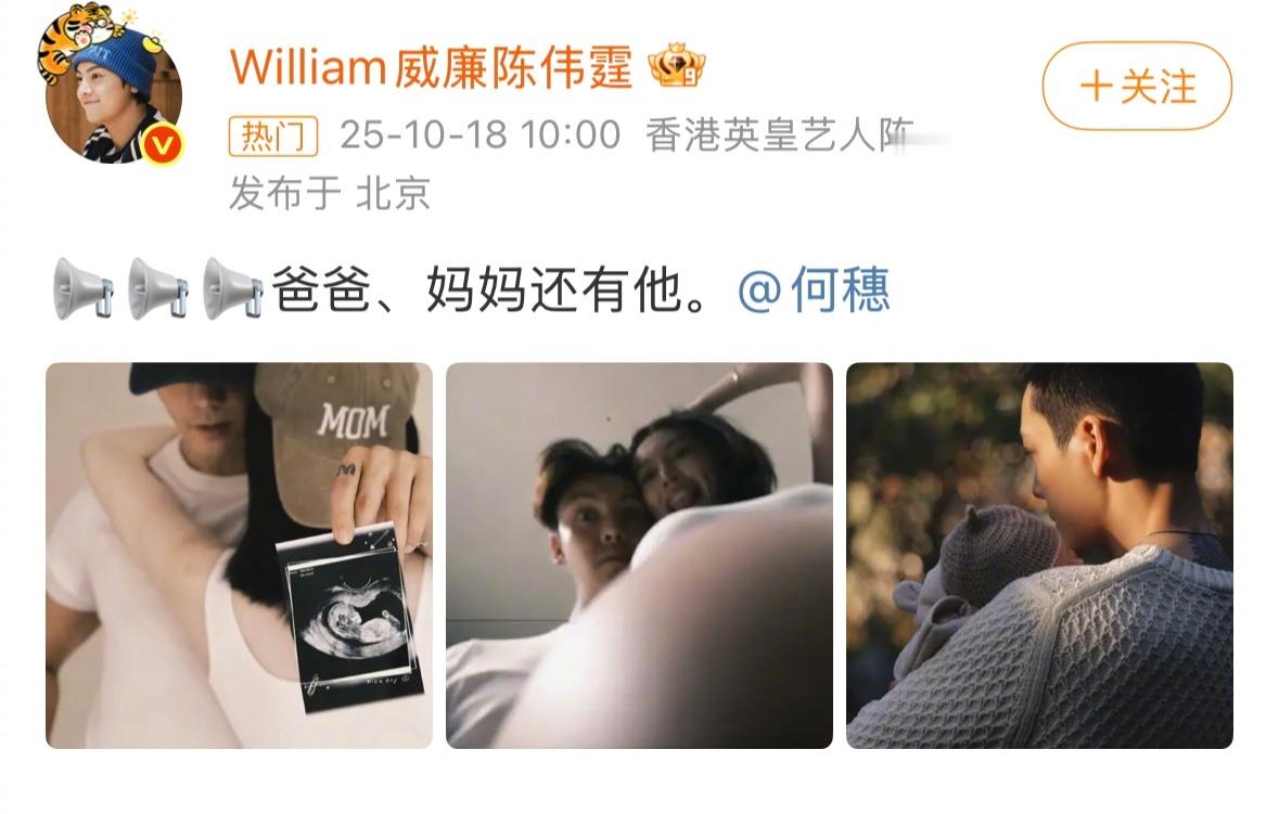 陈伟霆何穗官宣生子陈伟霆与何穗双双发博晒出孕期合照及与儿子合照:📢📢📢爸