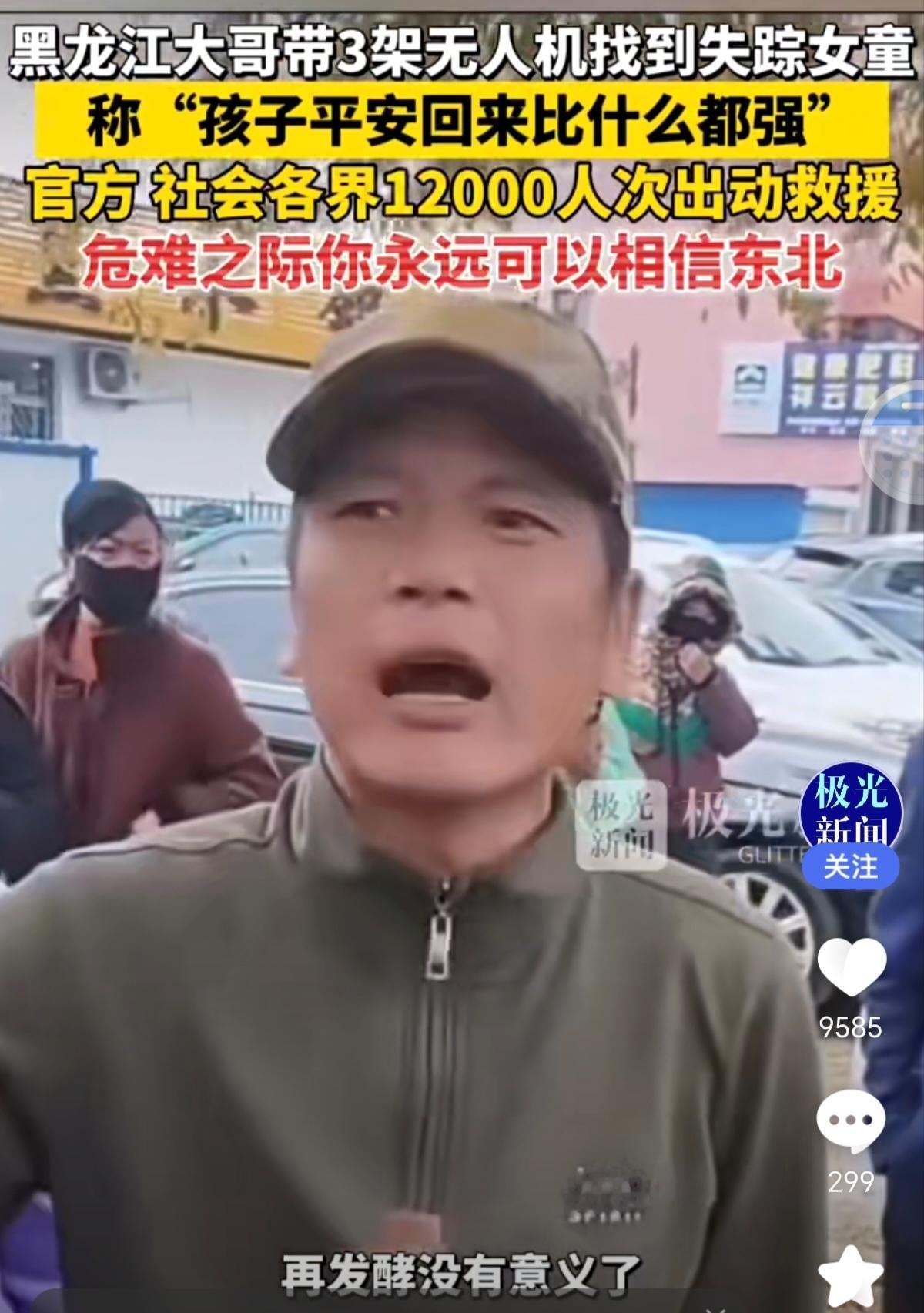 黑龙江大哥带3架无人机与搜救犬驱车1200公里赶到辽宁黑水镇成功寻找到失踪女童!你要永远相信东北人,有事真上! 辽宁4岁女童失踪的消息传到网上,黑龙江双鸭山王古昌是当地护农驱赶队的一员,经常在深山野外寻找野猪,有着丰富的寻找经验,且配备有专业的热成像无人机。这东北大哥第一时间打点行装奔赴辽宁黑水镇,说巧不巧,大哥无人机消耗到第四块电池时,热成像发现山沟里有不明热源,飞近后确认是失踪女孩。 东北人有事真上,东北人包括内蒙古人,赤峰都有救援队参与搜救,12000人次,真感人!东北大哥朴实无华说:孩子找到比什么都好,再发酵就没有意义了!功德无量!