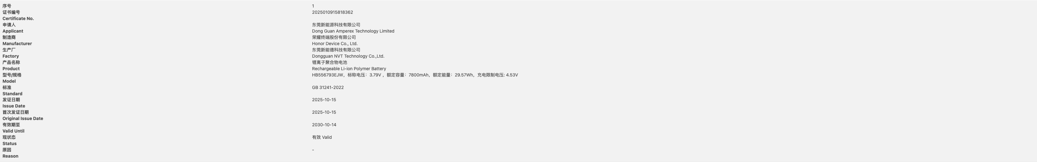 荣耀3C质量认证新增一块额定7800mAh电池,典型8开头没啥问题。会属于500系列还是GT2系列呢,不妨先猜一猜[卡皮巴拉]