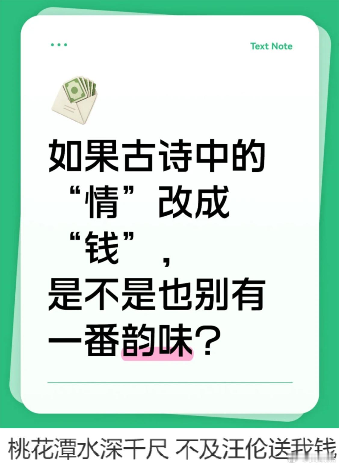 如果将古诗中的“情”改成“钱”,是不是也别有一番韵味?我先举一个:桃花潭水深千尺,不及汪伦送我钱