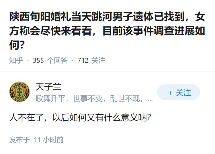 陕西旬阳婚礼当天跳河男子遗体已找到,女方称会尽快来看看,目前该事件调查进展如何?