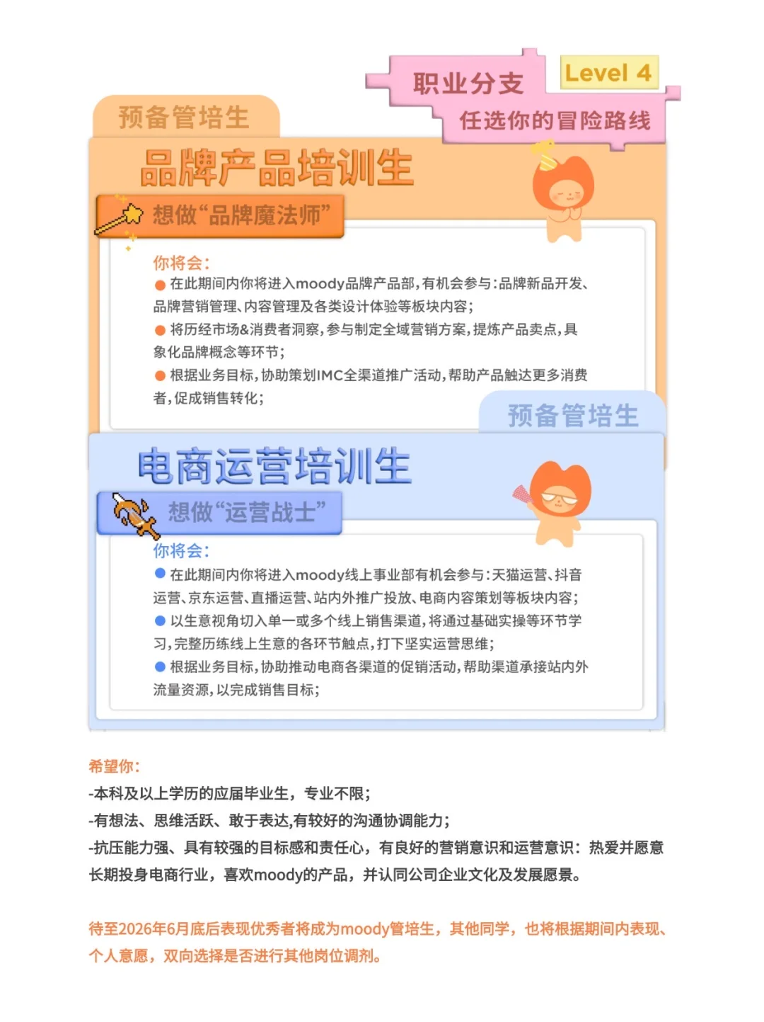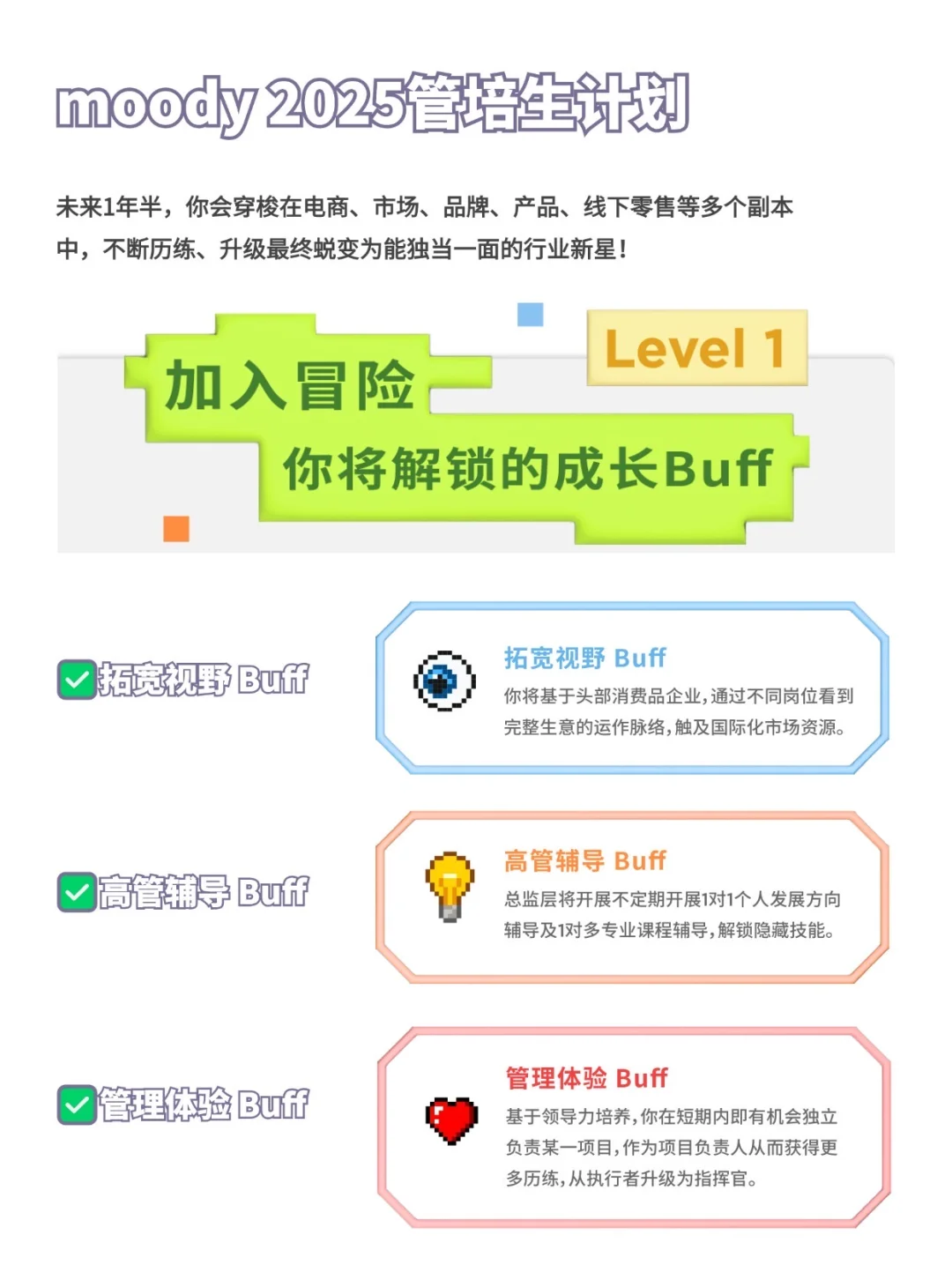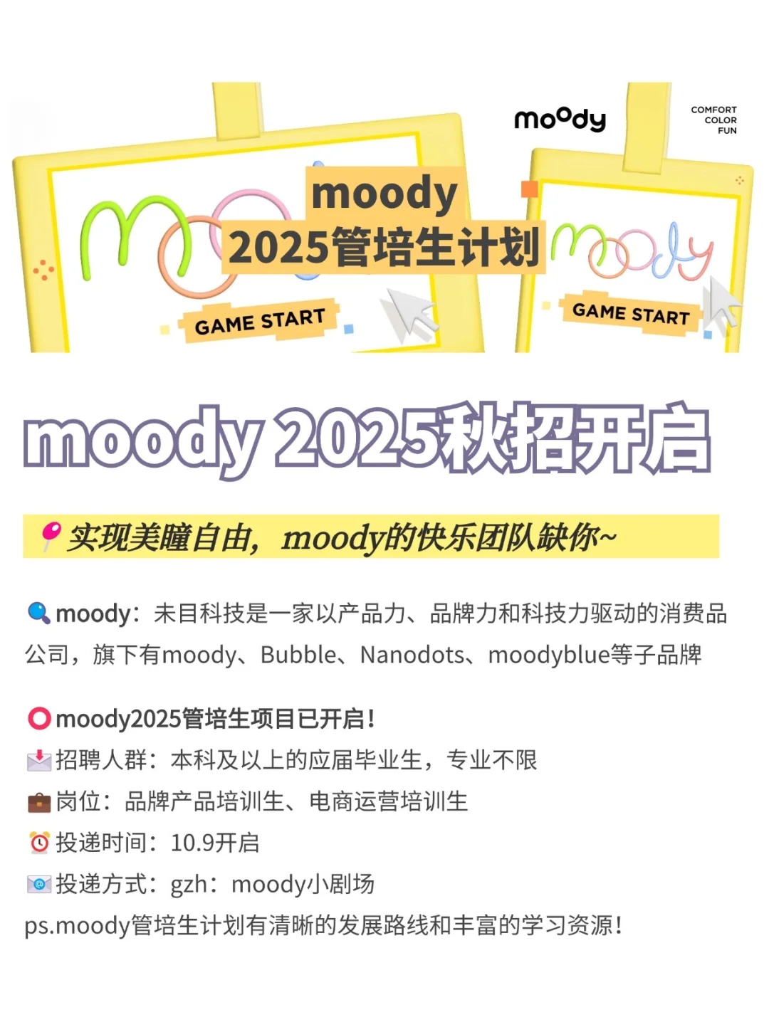 有品位、没班味、超快乐的神仙公司这就被我找到了! 更好的是:moody一年一度的秋招开启啦,成长冒险之旅来咯~ · 🔍关于moody 未目科技,是一家以产品力、品牌力和科技力驱动的消费品公司,旗下拥有moody、Bubble、Nanodots、moodyblue等子品牌;2019年成立于上海,以“不将就每一双眼睛”作为品牌目标;持续推出高品质、精设计、安全舒适的彩瞳产品,并尝试开拓丰富的眼部装饰产品 . 🔍在moody快乐工作每一天 🔹办公环境直接拉满颜值——随便一个角落都能拍出ins风大片! 🔹下午茶卷出新高度:不定期饮品更新,零食投喂,年轻人的喜好狠狠拿捏~ 🔹快乐是团队DNA:社团多到选择困难,户外/滑板/摄影/k歌/桌游~同事秒变好玩伴! 🔹团建=公费玩耍!迪士尼、泡温泉、徒步...在moody,EMO?不存在的~ 🔹美瞳自由只是基础操作,还有周年礼,每年都不一样~ 🔹每周五为毛孩子开放宠物日:能带毛孩子上班的公司还在犹豫什么?! · ⭕moody2025管培生项目已开启! 📩招聘人群:本科及以上的应届毕业生,专业不限 💼岗位:品牌产品培训生、电商运营培训生 ⏰投递时间:10.9开启 📧投递方式:gzh:moody小剧场 ps.moody管培生计划有清晰的发展路线和丰富的学习资源! · 下一站,moody快乐星球!快乐团队等你加入~ ·