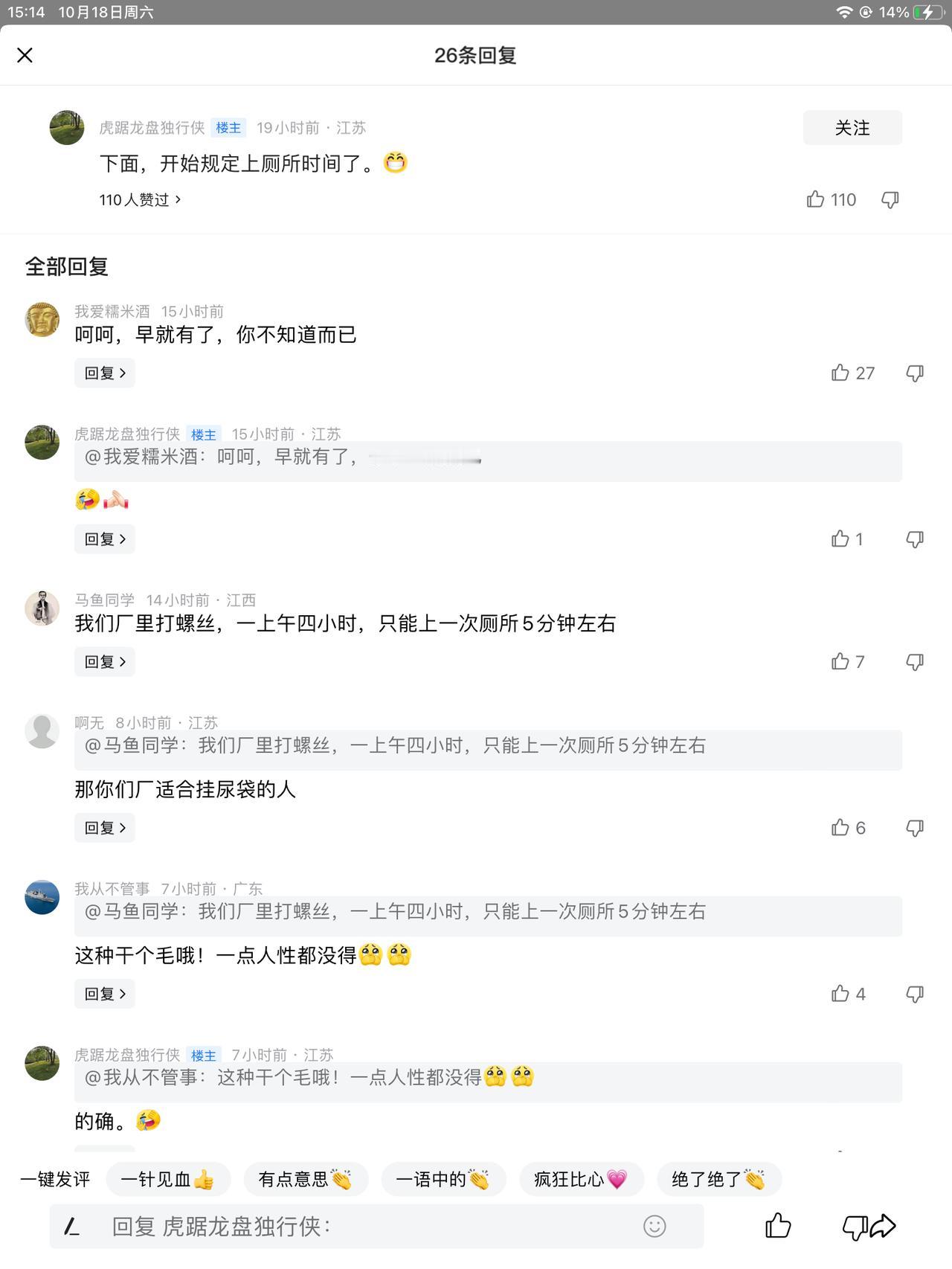 山东烟台某潍某柴公司规定员工一天工作时间内,喝水的时间,其他时间不能去喝水。并且不允许自己带水。水杯放在固定位置。到时间了,可以去喝水。一次的时间是五分钟。 烟台某网友把它发在网上,引起很大反响。 我有一事不明,喝了水,尿尿怎么办啊?尿尿时间没有嘛?能随便去厕所吗?还是说喝了水,你就赶快去尿尿。五分钟内,解决两样事情。 其实吧,这事儿他也不是说定的多么苛刻,只是他这样以文字的方式体现出来,总觉得他脑子有泡,泡里有水。水还不少。 以前我在富士康的时候,每天上午下午各有十分钟休息,你是坐着休息,还是去喝水,上厕所,都没人教给你。这也不用教吧? 你渴了,你就去喝点水,累了就坐一会。有便意了就去厕所。有时候人多排队,时间是挺赶的,有时候回来晚了,线 长看你一眼,也不多说什么。人有三急,屎尿屁,不知是不是这三个,差不多吧! 你这把它写出来,好像在向世界宣告,我是二比青年,大傻子似的。就跟写着~上班不允许穿开裆裤一样。有没有人不服,我就穿就穿!我想因该没有吧![星星眼][星星眼][星星眼][星星眼]