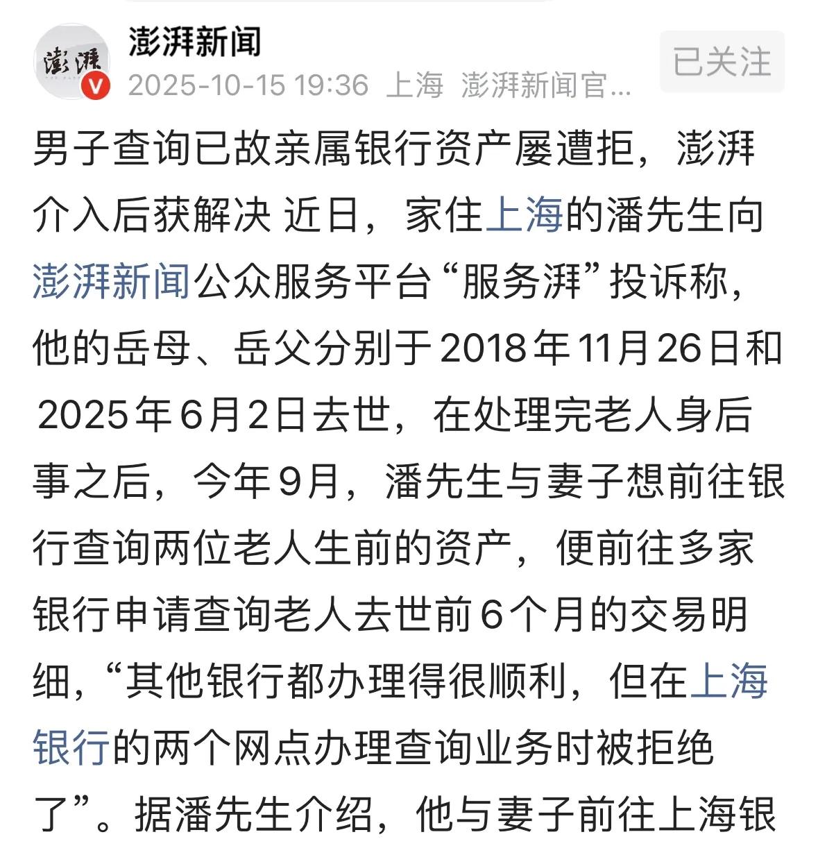 上海潘先生的岳父岳母先后离世,他和妻子去银行查询老人去世前6个月的账户流水,多家银行都顺利办理,唯独上海银行一口拒绝,理由是“必须提供继承证明”。潘先生拿出明文规定据理力争,银行却态度强硬,甚至放话“不服就去告”。最终在媒体介入后,银行才松口办理,双方和解。 一、查个流水咋就这么难?上海银行的“门槛”把人整懵了 潘先生这几个月真是又累又气!2018年岳母走了,今年6月岳父也撒手人寰,他和妻子忙前忙后料理完后事,想着得把老两口留下的资产理一理,特别是想看看老人去世前半年,银行账户里的钱都花在哪、转去哪了,心里也好有个数。 一开始跑其他银行,那叫一个顺利!妻子带着死亡证明、亲属关系证明(证明自己是老人亲闺女),一出示人家就懂了,很快就帮忙调出了流水,全程没耽误啥功夫。潘先生夫妻俩还想着,这事儿挺简单,赶紧弄完就踏实了。 可谁能想到,到了上海银行,直接被泼了一盆冷水!他们先去了一家上海银行网点,妻子说明来意:“想查我爸妈去世前6个月的账户流水。”柜台工作人员接过材料看了看,头一摇:“不行,少了继承证明,办不了!” 潘先生妻子当场就懵了:“我们就是查个流水,又不是取钱分遗产,要继承证明干啥?其他银行都没要这个啊!”她反复解释:“我是他们亲女儿,第一顺序继承人,材料都齐了,符合规定的!” 可工作人员油盐不进,就一句话:“这是我们内部规定,必须要继承证明,没有就不能查!” 夫妻俩不甘心,又跑到上海银行另一家支行,结果更气人!这边的说法跟之前一模一样,还是死咬着“要继承证明”不放。潘先生忍不住据理力争,没想到银行工作人员态度更硬,直接甩了句:“你们要是不认可,就去仲裁,去法院告啊!”这话一出口,直接把沟通的路堵死了,那副“爱咋咋地”的样子,把潘先生气得血压都快上来了。 本来是理所应当的事,怎么到了上海银行这儿,就变得这么难?潘先生想不通:自己又不是来闹事的,只是想查个流水,证明材料也都合规,凭啥就卡着不给办? 二、法律拆解:上海银行的“规定”,到底合不合法? 潘先生回家后越想越不服气,干脆翻起了相关规定,这不翻不知道,一翻更确定上海银行“不对劲”!这里面的法律和政策要点,咱普通人必须搞清楚,免得以后遇到同样的坑! 1. 明文规定摆着:第一顺序继承人查流水,根本不用“继承证明” 国家早就针对“已故存款人账户查询”出台过明确通知——《国家金融监督管理总局 中国人民银行关于优化已故存款人小额存款提取有关要求的通知》,其中第4条写得清清楚楚: 已故存款人的第一顺序继承人(配偶、子女、父母),只要有合法、正当理由,就有权向银行申请查询老人死亡后,以及死亡前6个月内的账户交易明细。银行必须简化手续,不能强制要求公证,也不能额外加不合理的条件! 划重点:第一顺序继承人(亲闺女肯定算)+ 死亡证明+亲属关系证明 = 符合查询条件!这里面压根没提“继承证明”这回事! 潘先生妻子作为老人的亲女儿,材料齐全,查询理由也正当(整理遗产、核实账目),完全符合规定。上海银行要求额外提供“继承证明”,本质上就是变相增设门槛,跟监管部门“简化手续、方便群众”的要求背道而驰,说白了就是“不合法”! 2. 银行的“内部规定”,不能凌驾于国家规定之上 上海银行工作人员一口一个“内部规定”,但法律上有个基本原则:单位内部规定不能对抗国家法律法规和监管政策! 监管通知已经明确说了“不得额外附加不合理条件”,银行非要加个“继承证明”,这就是典型的“不合理条件”。而且银行说的“必须取钱时才能查”“没卡没存折不能查”,也跟通知精神完全不符——查询流水和提取存款是两码事,只要身份和理由合法,就算没有银行卡,凭证明也能查! 银行之所以这么“死板”,说白了就是怕担责任:万一查了流水后,有其他亲属跳出来闹纠纷,或者担心信息泄露被追责。但怕担责不能成为“折腾群众”的理由,更不能用“内部规定”当挡箭牌,把本不该由群众承担的麻烦,全推给办事人。 3. 潘先生索赔200元,不是小题大做 潘先生最后不仅要求银行道歉,还索赔200元——包括来回跑网点的交通费、耽误工作的误工费,还有被银行恶劣态度气到的精神损失。很多人觉得“200块钱而已,至于吗?” 其实还真至于!这笔钱数额不大,但代表的是“公道”:潘先生夫妻俩为了查流水,前前后后跑了好几天,耽误工作不说,还受了一肚子气,这些都是银行的错误行为造成的。索赔200元,既是对自己损失的补偿,也是对银行“官僚作风”的一种警示——别拿群众的时间和心情不当回事! 你觉得上海银行一开始的做法合理吗?遇到银行“故意刁难”时,普通人该硬刚到底,还是认栽妥协?对于已故亲属存款查询,你觉得该怎么简化流程才合理?欢迎在评论区聊聊你的看法!