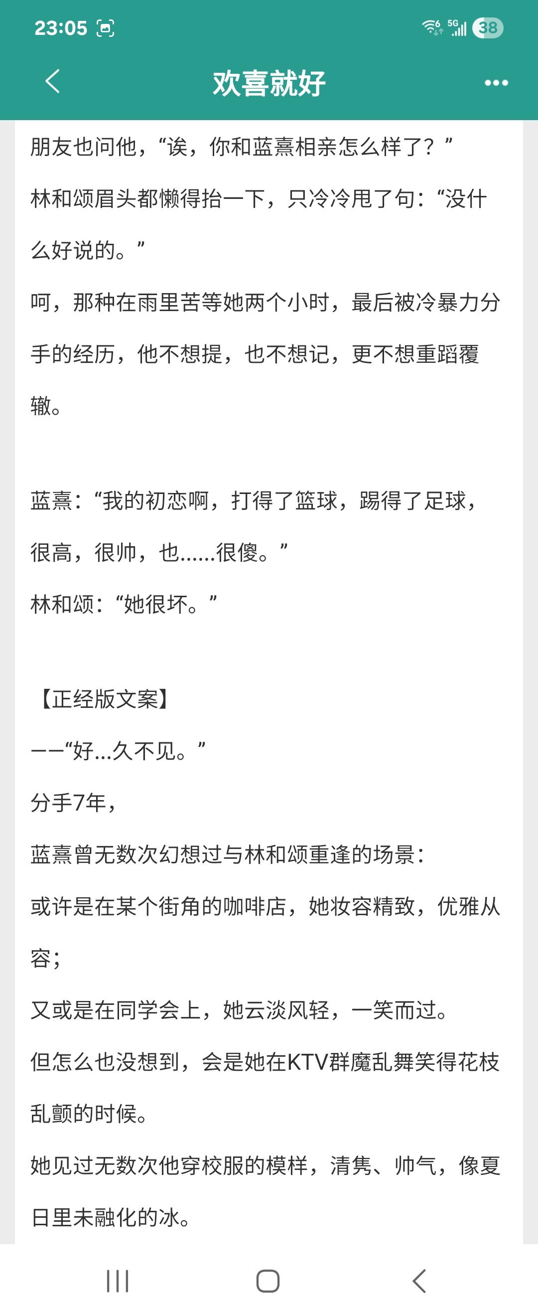 欢喜就好。一个完美的破镜重圆文。回忆里的校园时代好喜欢那种青涩的好感,到后来俩人重逢后的拉扯。