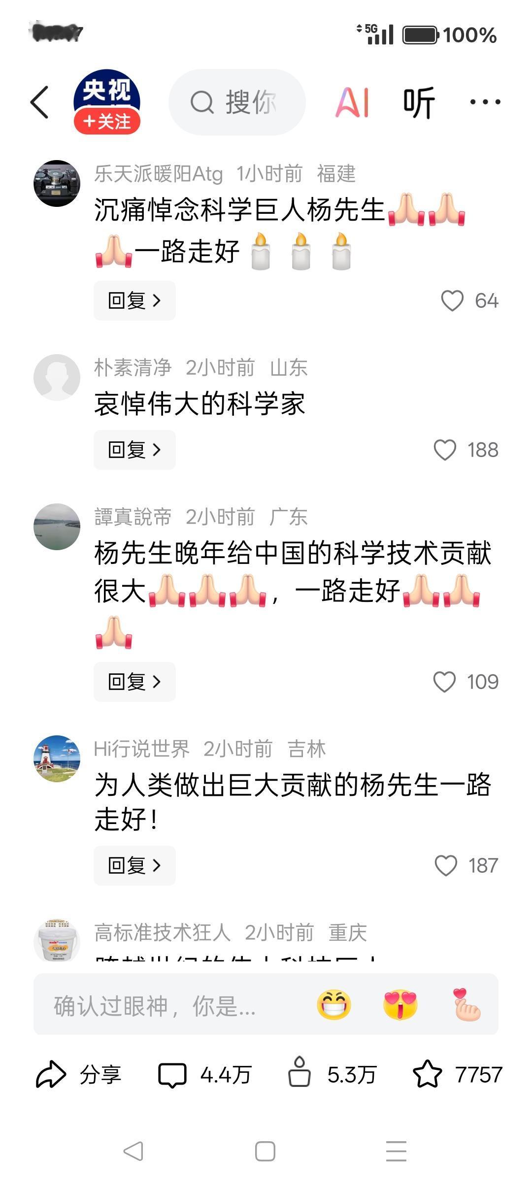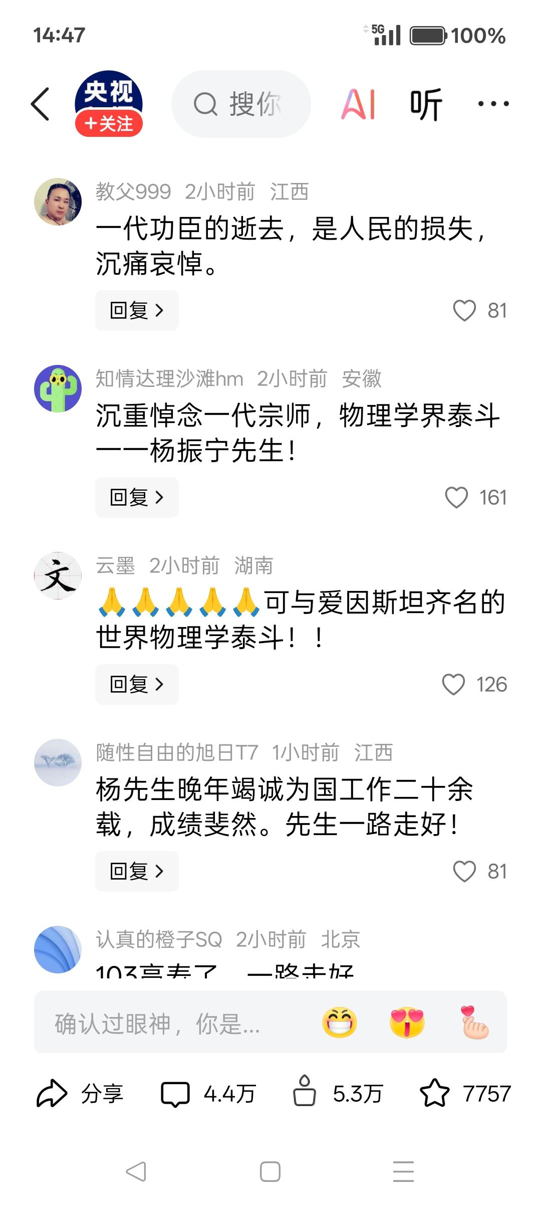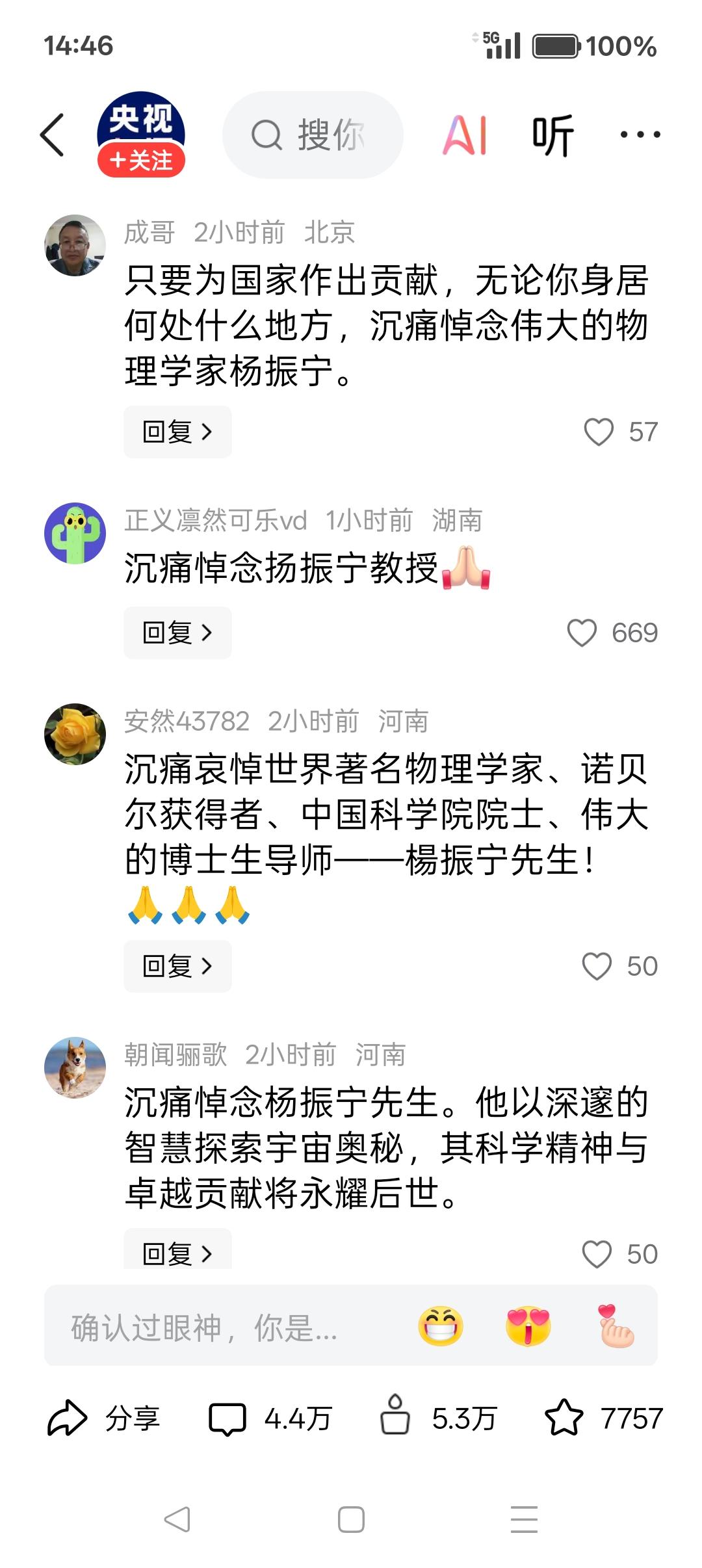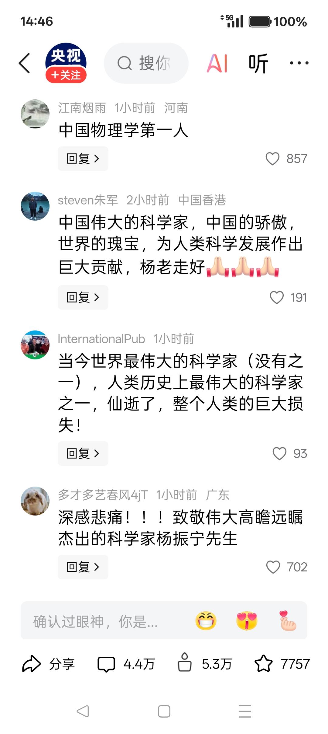 杨振宁老先生病逝,是中华民族不可估量的损失,他的一生是爱国、光荣、伟大、杰出、辉煌、奉献的一生。 杨老是第一个斩获代表世界科学最高水平诺贝尔奖的中国人,这意义特别重大。在他获奖之前,西方人对黄种人的歧视,尤其看不起中国人。 当时的西方社会,黄种人被视为劣等种族。中国人在海外常常遭遇不平等待遇,比如在就业、教育、生活等方面受到限制和歧视。 杨振宁赴美留学时,中国留学生们被安排在运兵船最下层甲板舱,美国士兵对他们态度轻蔑,常常言语侮辱和种族歧视 。他在美国买房时,也因为是中国人被房主拒绝 。 不仅如此,由于从鸦片战争开始,中国在长达一百多年里,被西方国家欺辱、宰割、掠夺,社会贫困落后,就连中国人自己都有一种不如西方人的自卑心理,盲目地认为外国的才是更好的。 当杨老获诺奖时,中国人惊讶地发现我们其实也并不比西方人差,西方人能攀登科技高峰,我们中国人也行。这样的认知改变,比诺奖本身更重要! 如今杨老病逝,网友们都纷纷表达深切哀思和沉痛悼念,对他的一生作出高度评价。他的不朽功绩绝不是极个别人的诽谤、污蔑、贬低、攻击、辱骂、恶意调侃所能够抹杀掉的,事实胜于诋毁。这就是公道自在人心。 杨老永垂不朽! 附: 杨老加入美国国籍的原因: 1. 科研需求:50年代中国科研基础薄弱,美国是物理研究中心,留美是学术突破的必然选择。 2. 时代限制:中美关系紧张、签证受限难即时归国,入美籍可获稳定科研身份与资源。 3. 情怀未改:入美籍只是为了科研便利,始终以华人身份自豪,从未割裂跟祖国的情感。 杨老于2003年正式回国,到他病逝时已经22年之久。虽然已80岁高龄,但是他依旧发光发热,为国家做出了常人难及的诸多重大贡献。回国后主要做了以下事情: 1. 推动高等教育与人才培养:2003年回国定居清华后,杨振宁把高等研究院的发展作为自己的新事业,2004年,82岁高龄的他亲自为本科新生讲授《大学物理》课程。2023年11月,他提出的清华大学物理人才培养“攀登计划”正式启动。 2. 推动学科建设:他以清华大学的名义发表了30多篇论文,倾力推动清华大学冷原子物理、凝聚态物理、密码学等基础学科的发展,将清华大学物理系提升至世界级水平。 3. 募集资金支持科研:他不仅长期不领年薪,还将个人积蓄与美国的房产捐给清华,累计筹措资金逾亿元,为吸引和培育顶尖人才搭建了平台。 4. 促进学术交流与合作:2018年,他应邀担任“科学探索奖”的共同发起人,凭借自身国际影响力,促进了中国与世界的学术交流与合作。 5. 捐赠个人珍藏物品:2021年5月,杨振宁将自己珍藏的2000余件图书、文章手稿、影像资料和艺术品捐赠给清华大学,在学校图书馆设立“杨振宁资料室”。