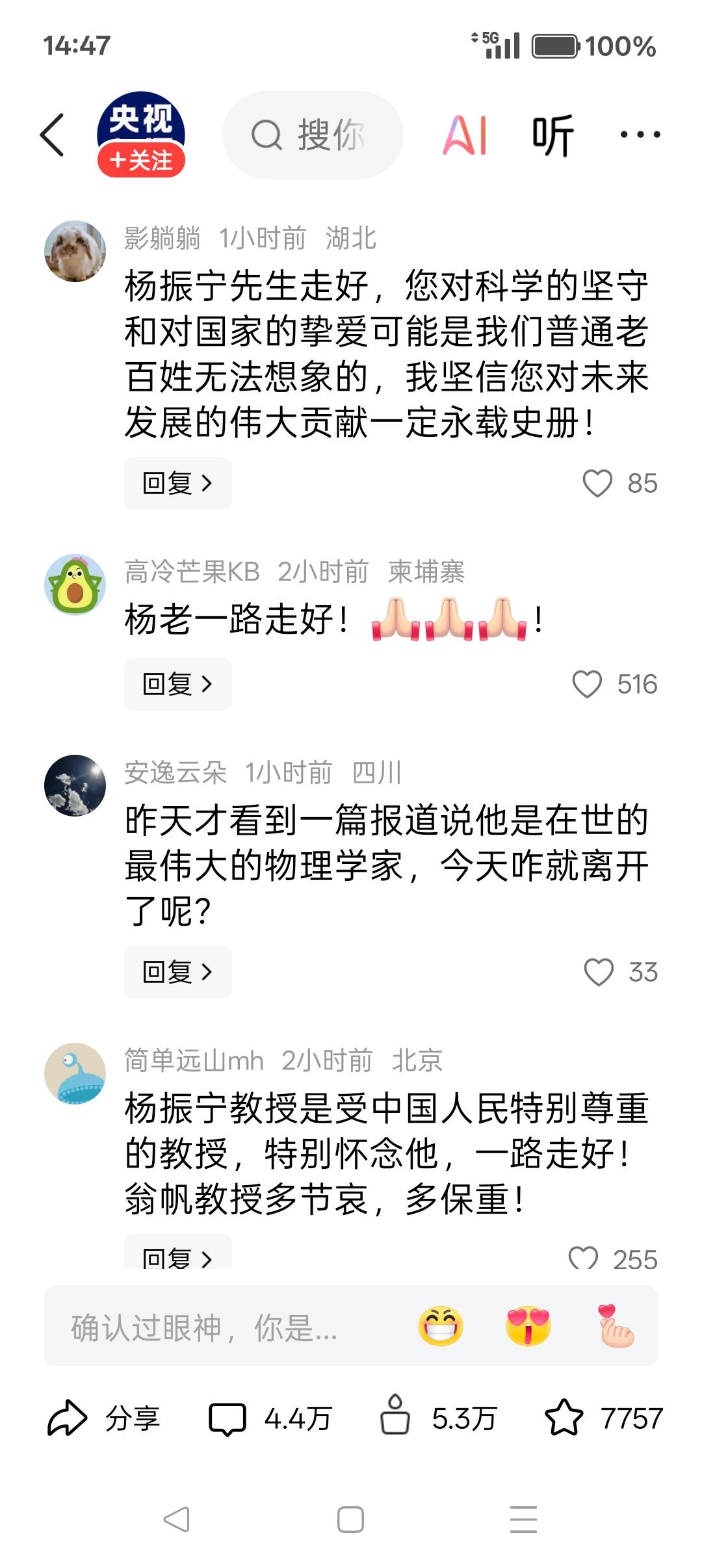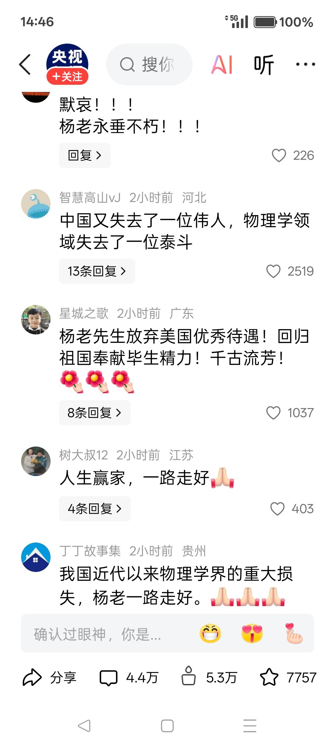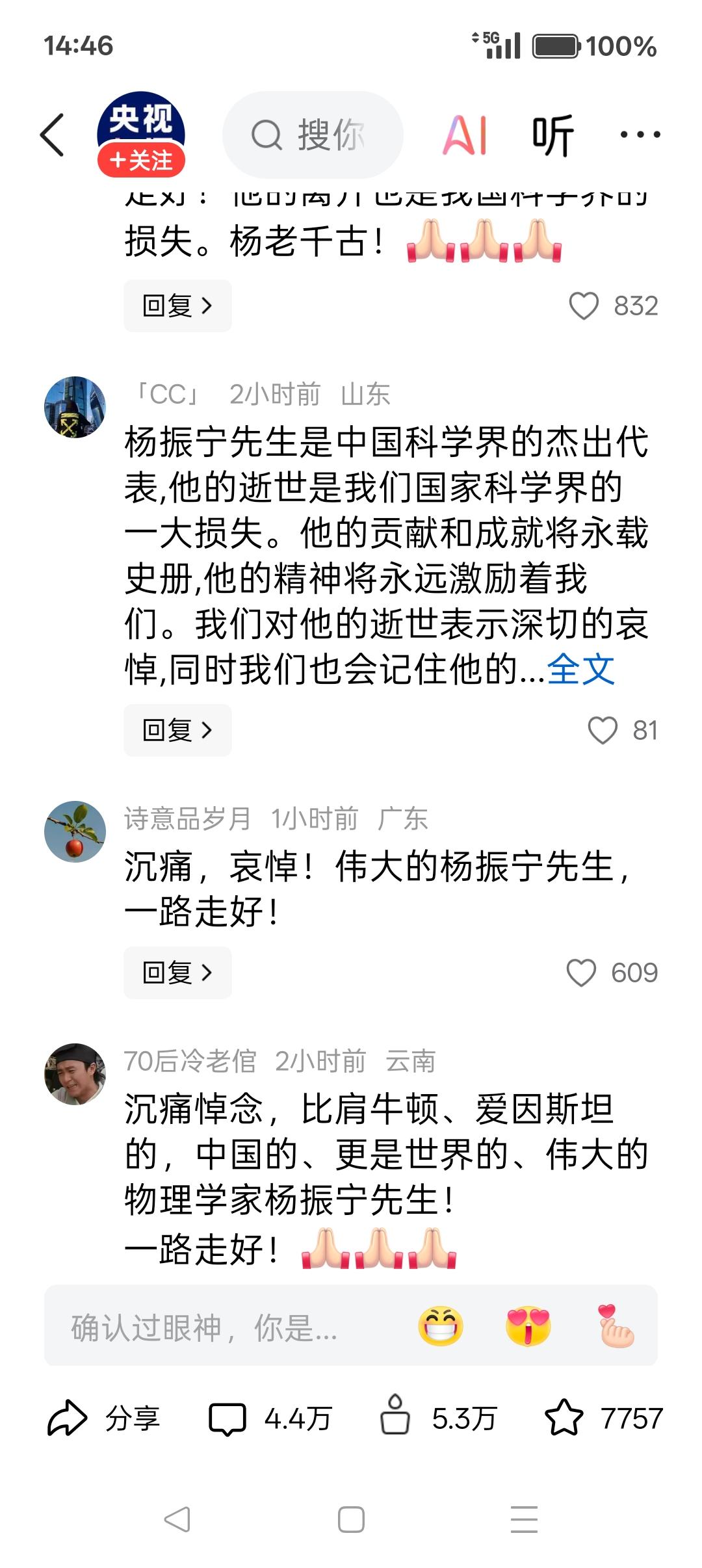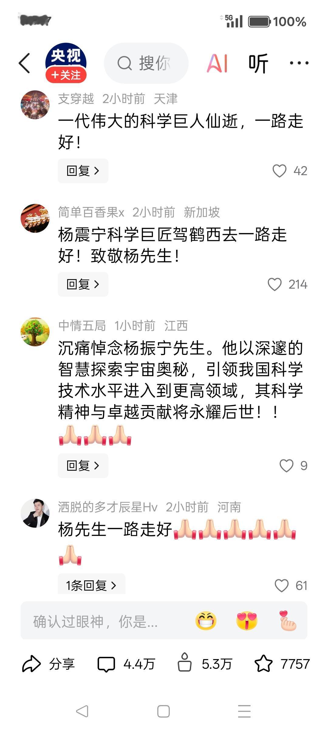 杨振宁老先生病逝,是中华民族不可估量的损失,他的一生是爱国、光荣、伟大、杰出、辉煌、奉献的一生。 杨老是第一个斩获代表世界科学最高水平诺贝尔奖的中国人,这意义特别重大。在他获奖之前,西方人对黄种人的歧视,尤其看不起中国人。 当时的西方社会,黄种人被视为劣等种族。中国人在海外常常遭遇不平等待遇,比如在就业、教育、生活等方面受到限制和歧视。 杨振宁赴美留学时,中国留学生们被安排在运兵船最下层甲板舱,美国士兵对他们态度轻蔑,常常言语侮辱和种族歧视 。他在美国买房时,也因为是中国人被房主拒绝 。 不仅如此,由于从鸦片战争开始,中国在长达一百多年里,被西方国家欺辱、宰割、掠夺,社会贫困落后,就连中国人自己都有一种不如西方人的自卑心理,盲目地认为外国的才是更好的。 当杨老获诺奖时,中国人惊讶地发现我们其实也并不比西方人差,西方人能攀登科技高峰,我们中国人也行。这样的认知改变,比诺奖本身更重要! 如今杨老病逝,网友们都纷纷表达深切哀思和沉痛悼念,对他的一生作出高度评价。他的不朽功绩绝不是极个别人的诽谤、污蔑、贬低、攻击、辱骂、恶意调侃所能够抹杀掉的,事实胜于诋毁。这就是公道自在人心。 杨老永垂不朽! 附: 杨老加入美国国籍的原因: 1. 科研需求:50年代中国科研基础薄弱,美国是物理研究中心,留美是学术突破的必然选择。 2. 时代限制:中美关系紧张、签证受限难即时归国,入美籍可获稳定科研身份与资源。 3. 情怀未改:入美籍只是为了科研便利,始终以华人身份自豪,从未割裂跟祖国的情感。 杨老于2003年正式回国,到他病逝时已经22年之久。虽然已80岁高龄,但是他依旧发光发热,为国家做出了常人难及的诸多重大贡献。回国后主要做了以下事情: 1. 推动高等教育与人才培养:2003年回国定居清华后,杨振宁把高等研究院的发展作为自己的新事业,2004年,82岁高龄的他亲自为本科新生讲授《大学物理》课程。2023年11月,他提出的清华大学物理人才培养“攀登计划”正式启动。 2. 推动学科建设:他以清华大学的名义发表了30多篇论文,倾力推动清华大学冷原子物理、凝聚态物理、密码学等基础学科的发展,将清华大学物理系提升至世界级水平。 3. 募集资金支持科研:他不仅长期不领年薪,还将个人积蓄与美国的房产捐给清华,累计筹措资金逾亿元,为吸引和培育顶尖人才搭建了平台。 4. 促进学术交流与合作:2018年,他应邀担任“科学探索奖”的共同发起人,凭借自身国际影响力,促进了中国与世界的学术交流与合作。 5. 捐赠个人珍藏物品:2021年5月,杨振宁将自己珍藏的2000余件图书、文章手稿、影像资料和艺术品捐赠给清华大学,在学校图书馆设立“杨振宁资料室”。