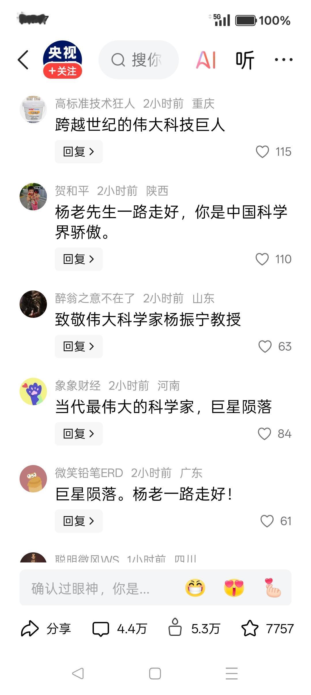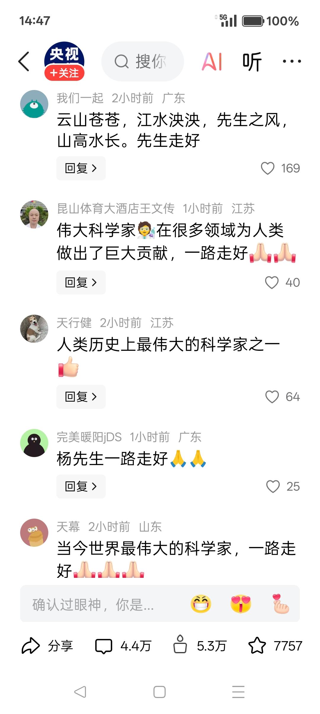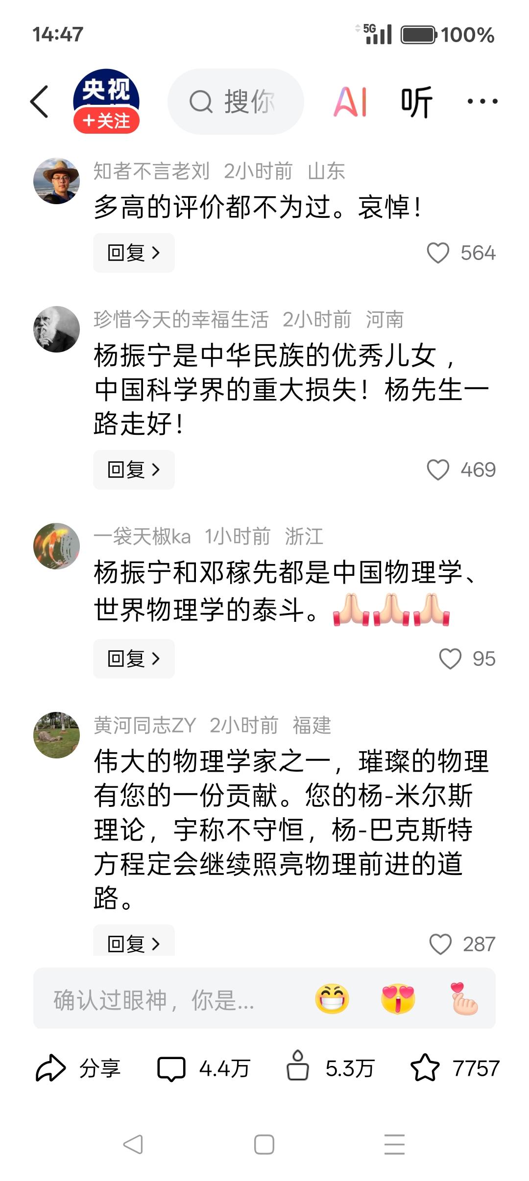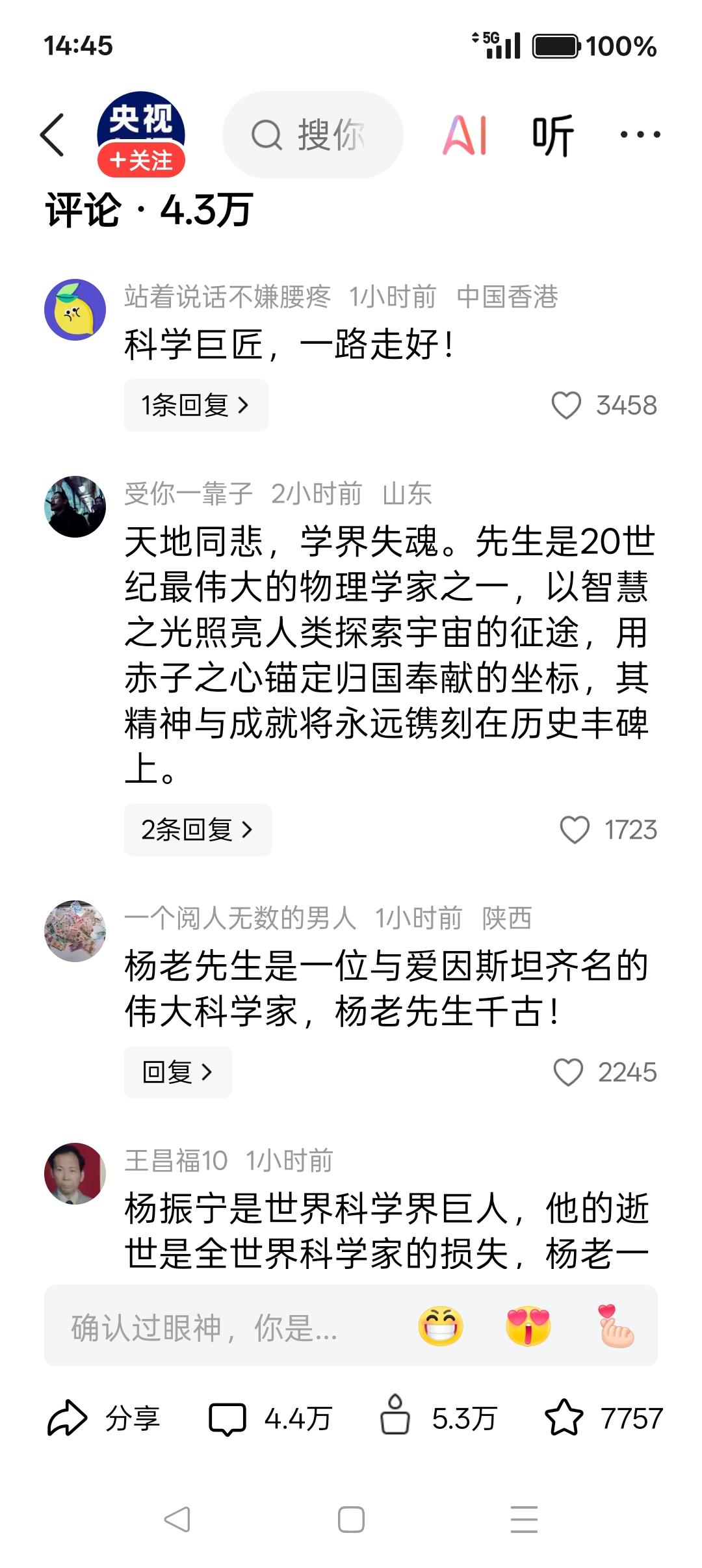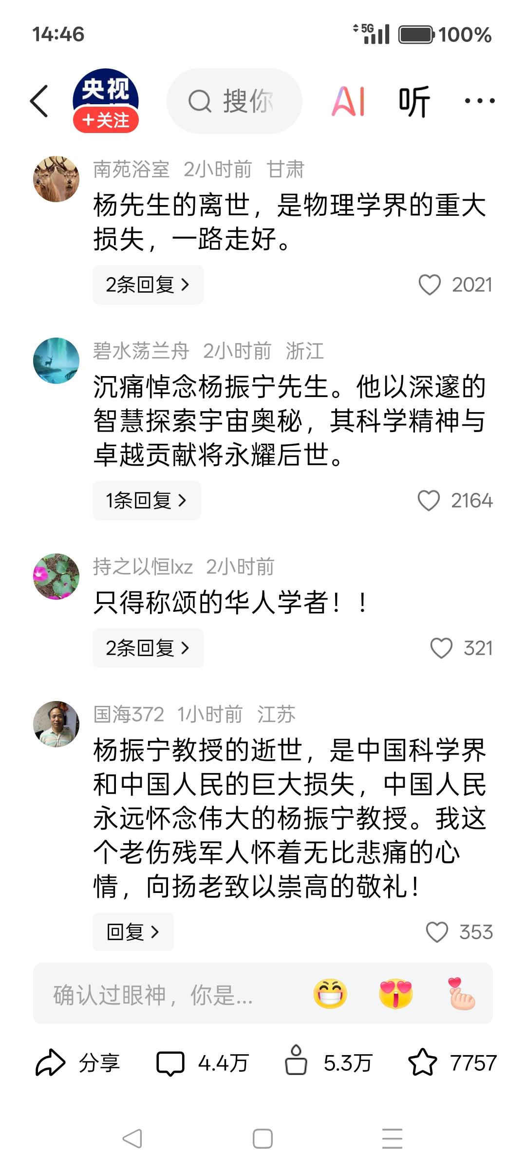 杨振宁老先生病逝,是中华民族不可估量的损失,他的一生是爱国、光荣、伟大、杰出、辉煌、奉献的一生。 杨老是第一个斩获代表世界科学最高水平诺贝尔奖的中国人,这意义特别重大。在他获奖之前,西方人对黄种人的歧视,尤其看不起中国人。 当时的西方社会,黄种人被视为劣等种族。中国人在海外常常遭遇不平等待遇,比如在就业、教育、生活等方面受到限制和歧视。 杨振宁赴美留学时,中国留学生们被安排在运兵船最下层甲板舱,美国士兵对他们态度轻蔑,常常言语侮辱和种族歧视 。他在美国买房时,也因为是中国人被房主拒绝 。 不仅如此,由于从鸦片战争开始,中国在长达一百多年里,被西方国家欺辱、宰割、掠夺,社会贫困落后,就连中国人自己都有一种不如西方人的自卑心理,盲目地认为外国的才是更好的。 当杨老获诺奖时,中国人惊讶地发现我们其实也并不比西方人差,西方人能攀登科技高峰,我们中国人也行。这样的认知改变,比诺奖本身更重要! 如今杨老病逝,网友们都纷纷表达深切哀思和沉痛悼念,对他的一生作出高度评价。他的不朽功绩绝不是极个别人的诽谤、污蔑、贬低、攻击、辱骂、恶意调侃所能够抹杀掉的,事实胜于诋毁。这就是公道自在人心。 杨老永垂不朽! 附: 杨老加入美国国籍的原因: 1. 科研需求:50年代中国科研基础薄弱,美国是物理研究中心,留美是学术突破的必然选择。 2. 时代限制:中美关系紧张、签证受限难即时归国,入美籍可获稳定科研身份与资源。 3. 情怀未改:入美籍只是为了科研便利,始终以华人身份自豪,从未割裂跟祖国的情感。 杨老于2003年正式回国,到他病逝时已经22年之久。虽然已80岁高龄,但是他依旧发光发热,为国家做出了常人难及的诸多重大贡献。回国后主要做了以下事情: 1. 推动高等教育与人才培养:2003年回国定居清华后,杨振宁把高等研究院的发展作为自己的新事业,2004年,82岁高龄的他亲自为本科新生讲授《大学物理》课程。2023年11月,他提出的清华大学物理人才培养“攀登计划”正式启动。 2. 推动学科建设:他以清华大学的名义发表了30多篇论文,倾力推动清华大学冷原子物理、凝聚态物理、密码学等基础学科的发展,将清华大学物理系提升至世界级水平。 3. 募集资金支持科研:他不仅长期不领年薪,还将个人积蓄与美国的房产捐给清华,累计筹措资金逾亿元,为吸引和培育顶尖人才搭建了平台。 4. 促进学术交流与合作:2018年,他应邀担任“科学探索奖”的共同发起人,凭借自身国际影响力,促进了中国与世界的学术交流与合作。 5. 捐赠个人珍藏物品:2021年5月,杨振宁将自己珍藏的2000余件图书、文章手稿、影像资料和艺术品捐赠给清华大学,在学校图书馆设立“杨振宁资料室”。
