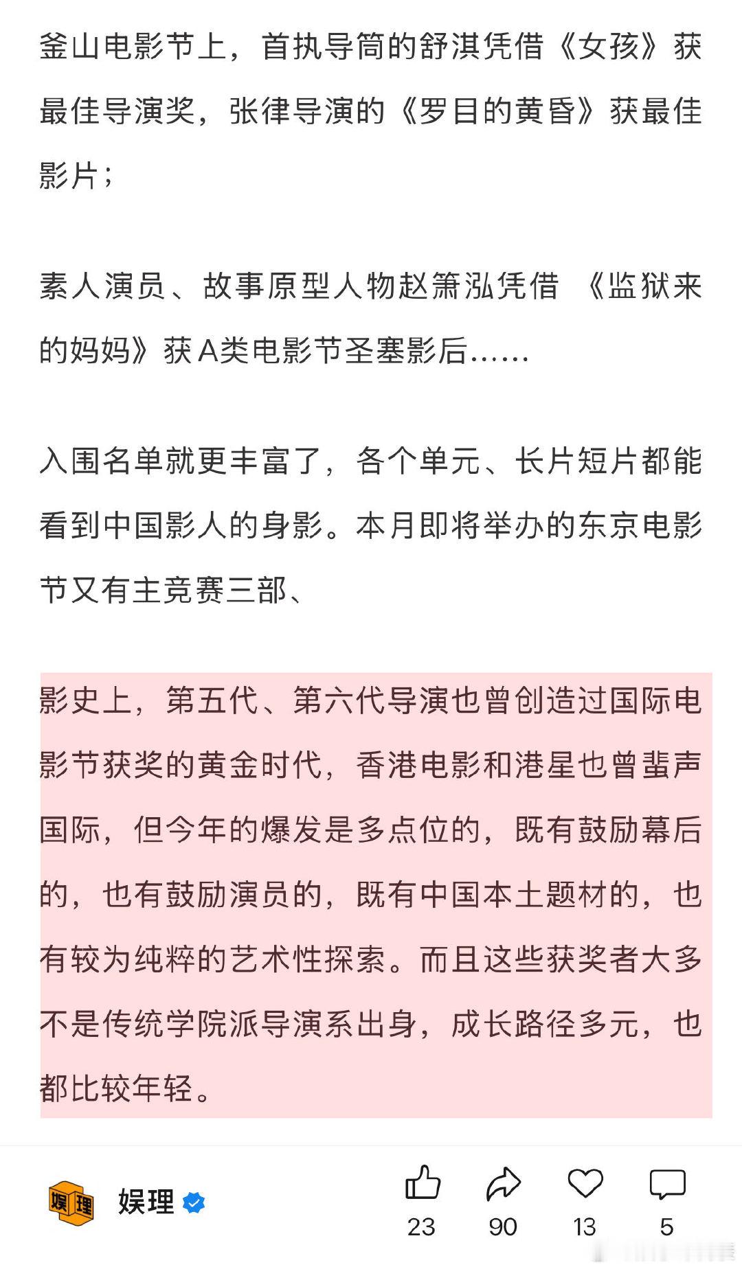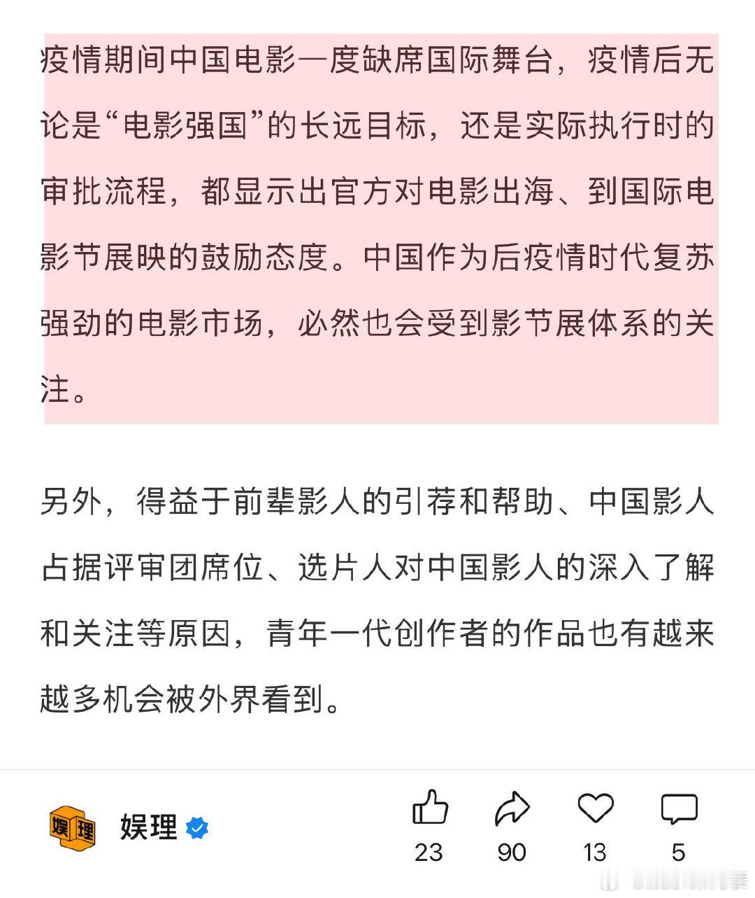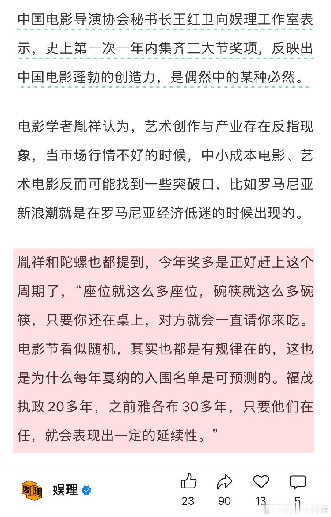缺钱仍是电影行业最现实的困境 电影节能助力电影宣发吗 中国电影导演协会秘书长王红卫向表示,史上第一次一年内集齐三大节奖项,反映出中国电影蓬勃的创造力。电影学者胤祥和陀螺也都提到,“电影节看似随机,其实也都是有规律在的…福茂执政20多年,之前雅各布30多年,只要他们在任,就会表现出一定的延续性。”娱理独家↓