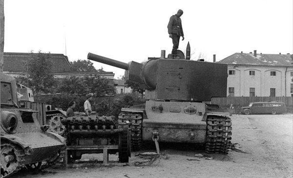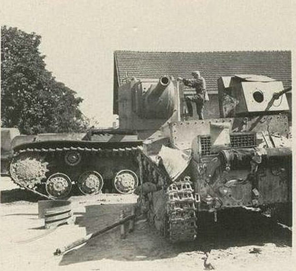 德军检查一辆被俘的苏制KV-2重型坦克,1941年7月摄于乌克兰利沃夫。 这辆坦克大致在1940年11月至12月间出厂,隶属于西南方面军第6集团军第4机械化军第8坦克师。在照片中还可看到一辆隶属于第68坦克团的OT-26喷火坦克,1941年6月25日因发动机故障移交维修营,此外还有一辆所属部队不明的共青团员轻型装甲牵引车。 1941年7月1日,利沃夫市被红军部队放弃,这些无法及时修复也无法携带的装备被遗弃在该市的82号维修基地。