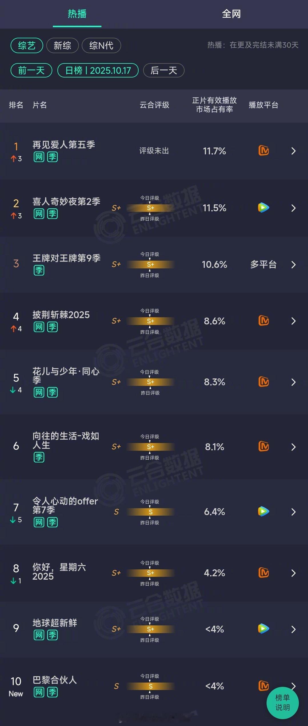 2025年10月17日云合综艺正片有效播放量市占率TOP10