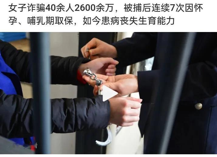 女子诈骗2600余万,靠怀孕哺乳期7次取保,如今丧失生育能力,这算钻空子还是另有隐情? 你听说过靠怀孕、哺乳期“免罪”的操作吗?一女子诈骗40多人2600多万,被捕后连续7次因怀孕、哺乳期取保候审,现在却患病丧失了生育能力。 这操作真让人无语!当初为了逃避法律制裁一次次钻空子,现在落得这地步,是该同情还是觉得是自作自受?法律的人性化规定,不该成为违法者的“保护伞”。咱们得想想,怎么才能让这种钻漏洞的行为无处遁形,既保障合法权益,又不让不法分子有机可乘。 你觉得这种情况该怎么处理才合理?来评论区说说你的想法。