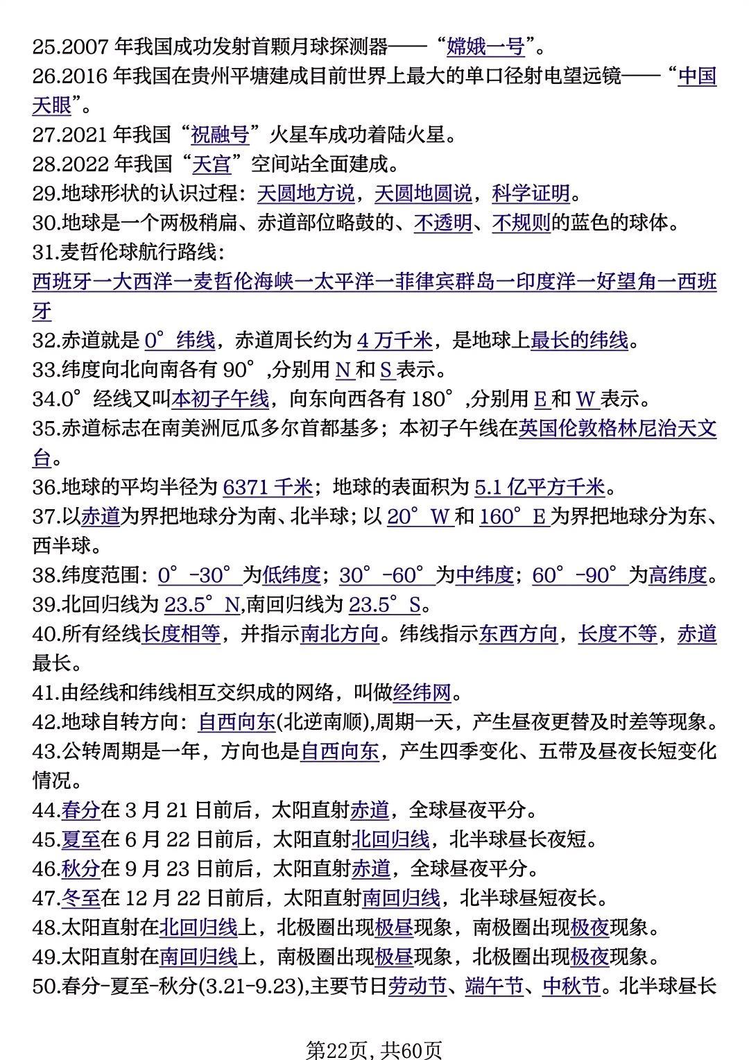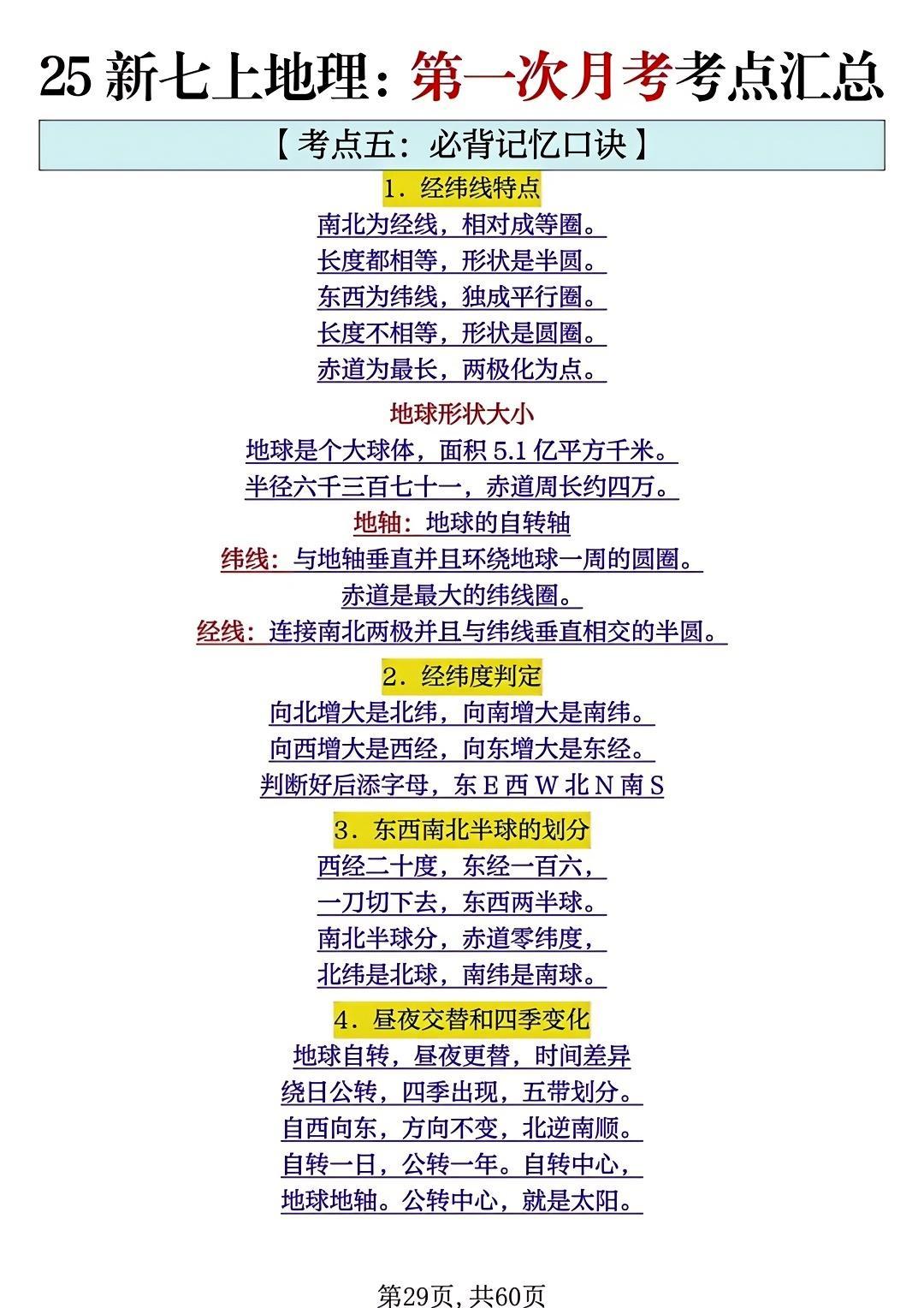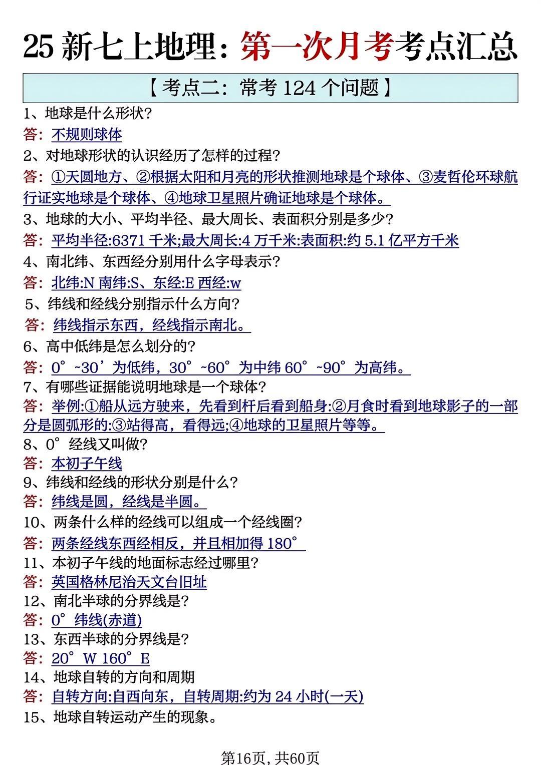 七年级地理上册期中必背高频考点50个!