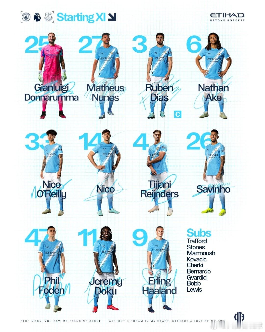 10月18日讯 北京时间今晚22点,英超第8轮,曼城°主场迎战埃弗顿°,赛前双方公布首发阵容。